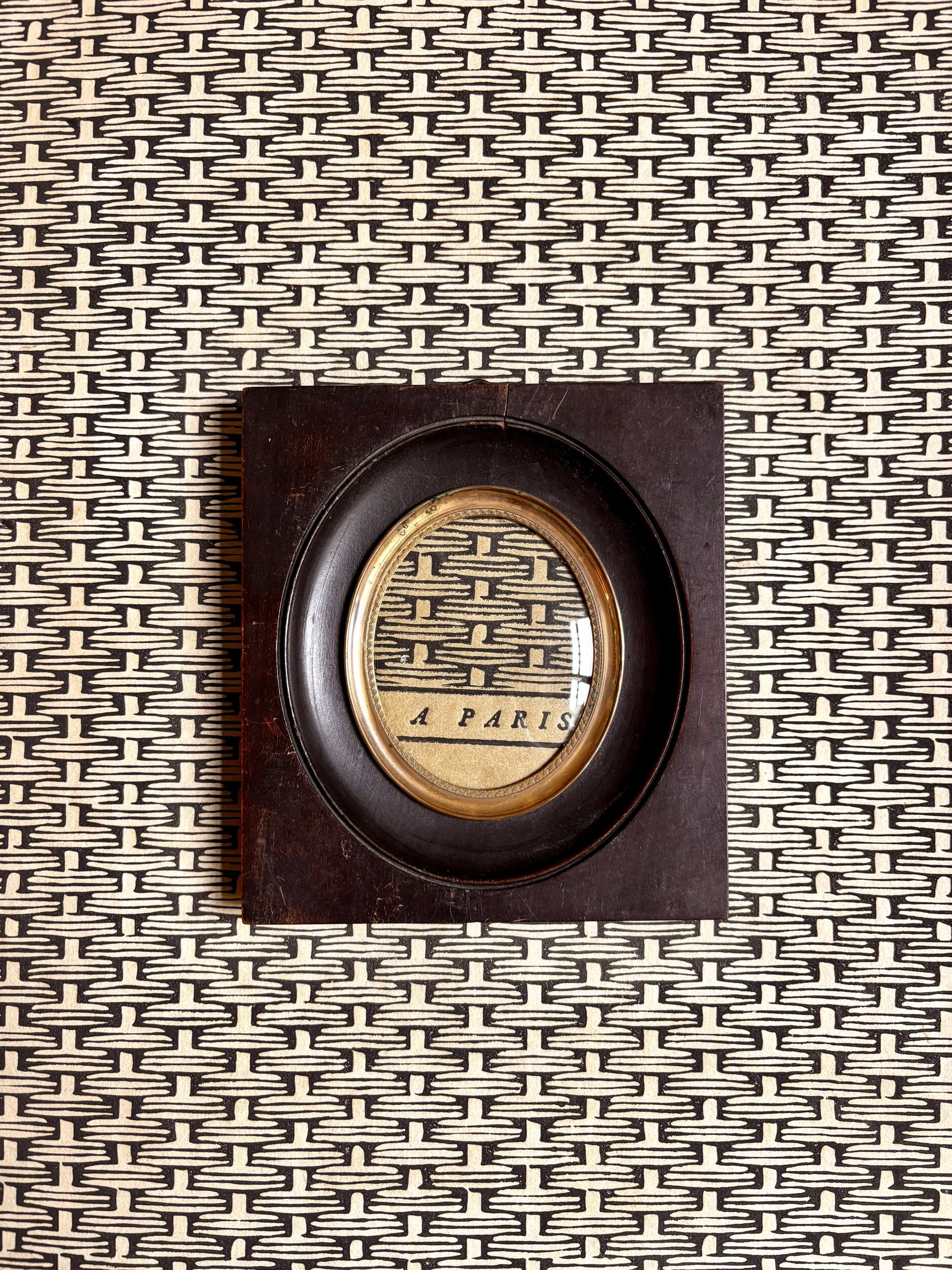 Cadre composé d'un cadre en bois foncé mouluré, d’un cerclage en laiton et d’un verre protégeant un détail du papier dominoté 18B "Osier" Antoinette Poisson peint à la main.