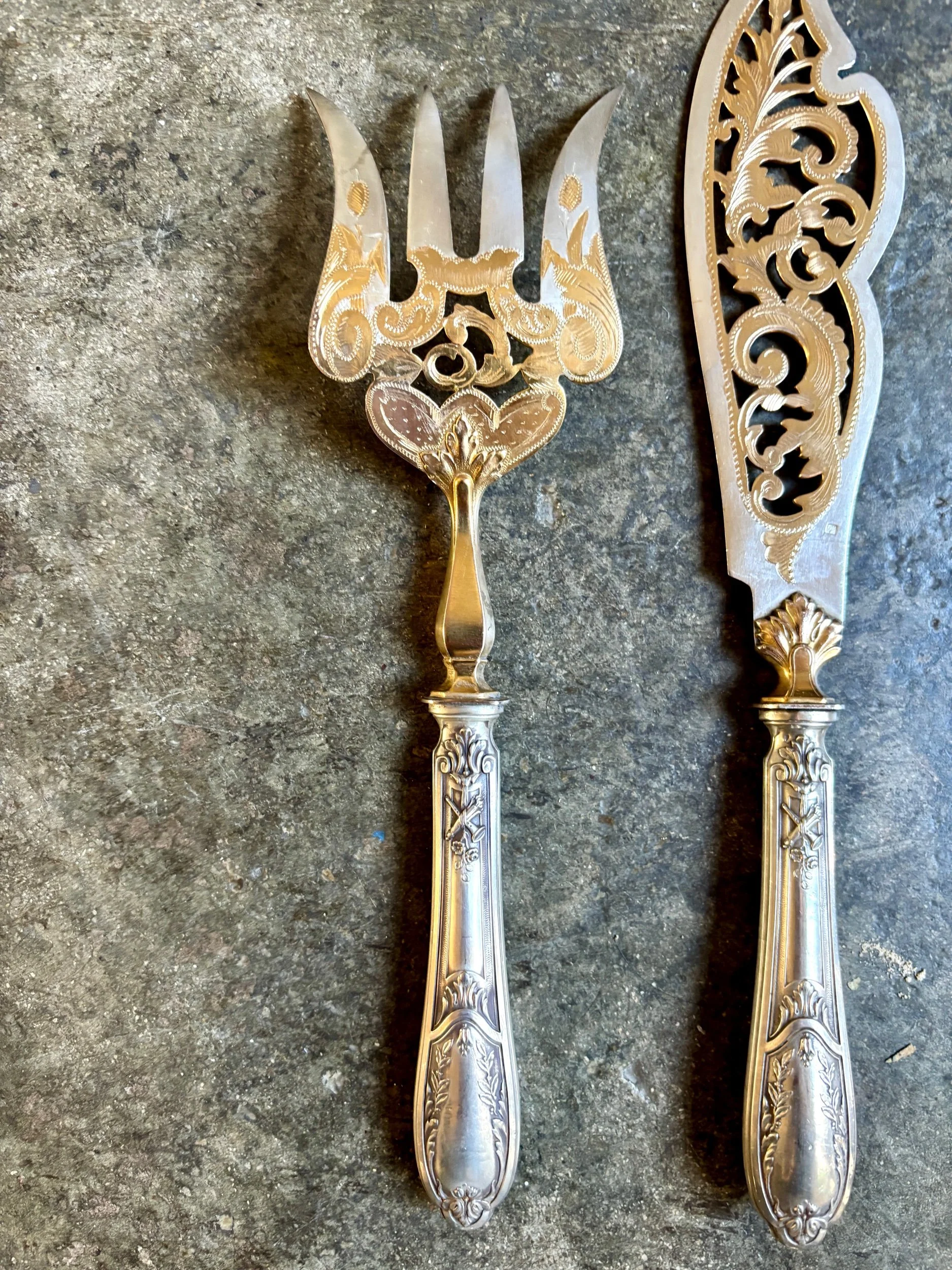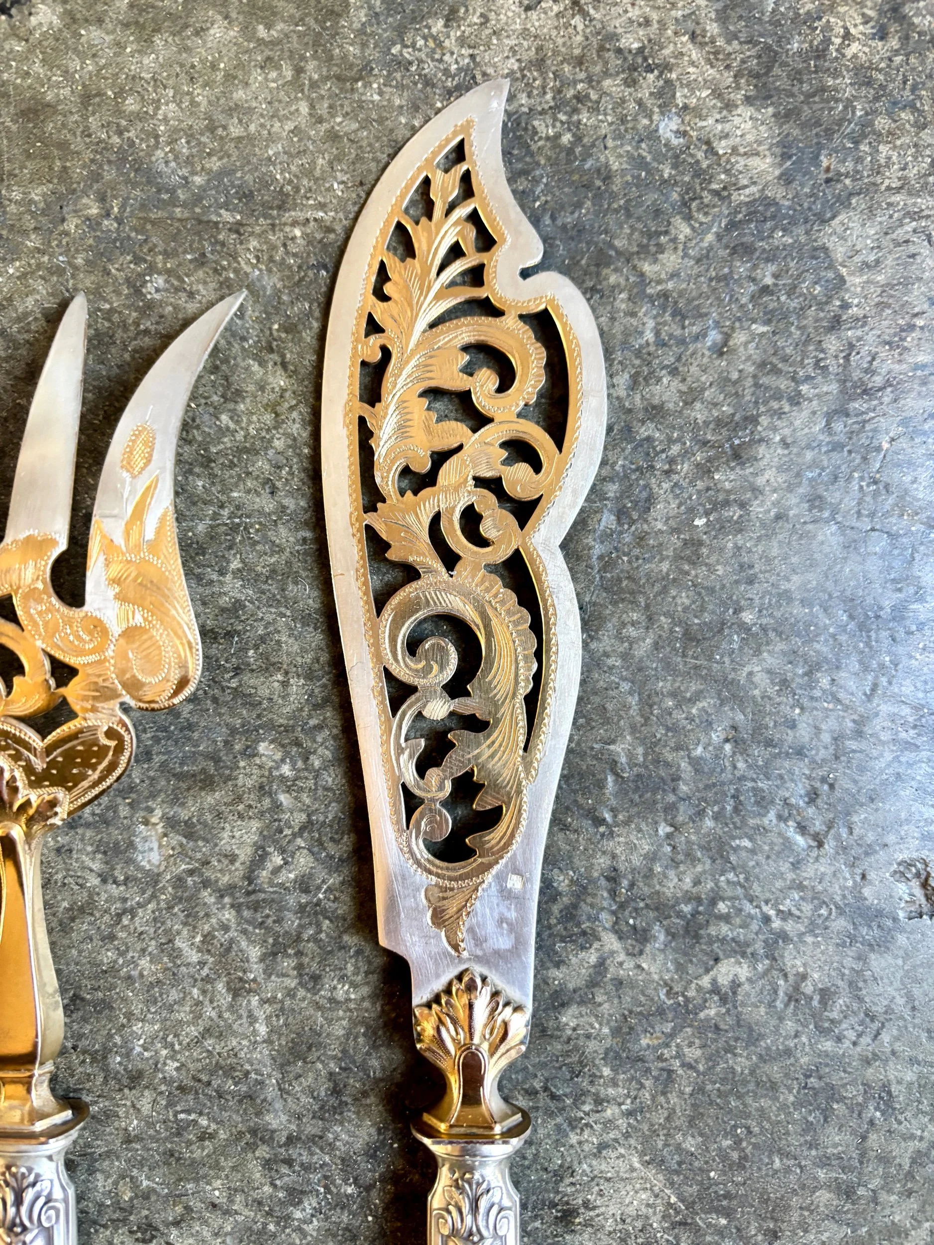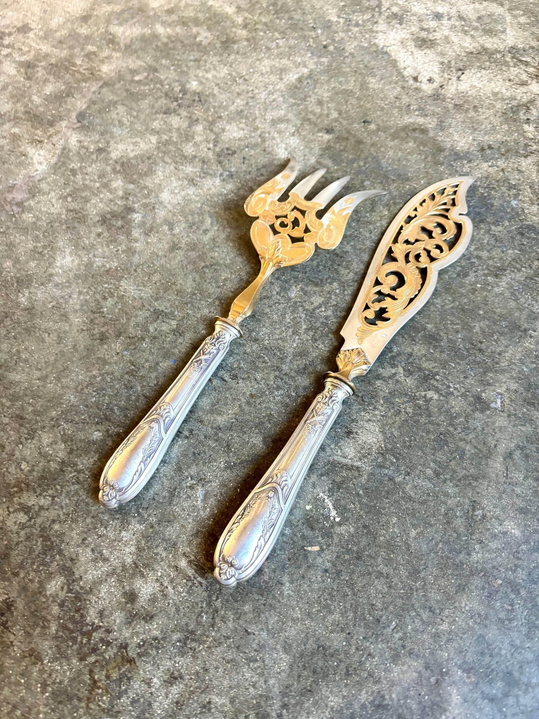 Paire de couverts de service à poisson composée d’une fourchette et d’un couteau : chaque manche fourré est en argent massif, martelé et ciselé avec de belles volutes. La fourchette en vermeil à trois dents avec pointes présente de beaux reliefs végétaux et de belles ciselures à volutes ; la lame du couteau de forme libre et en vermeil est lisse et décorée de la même façon.