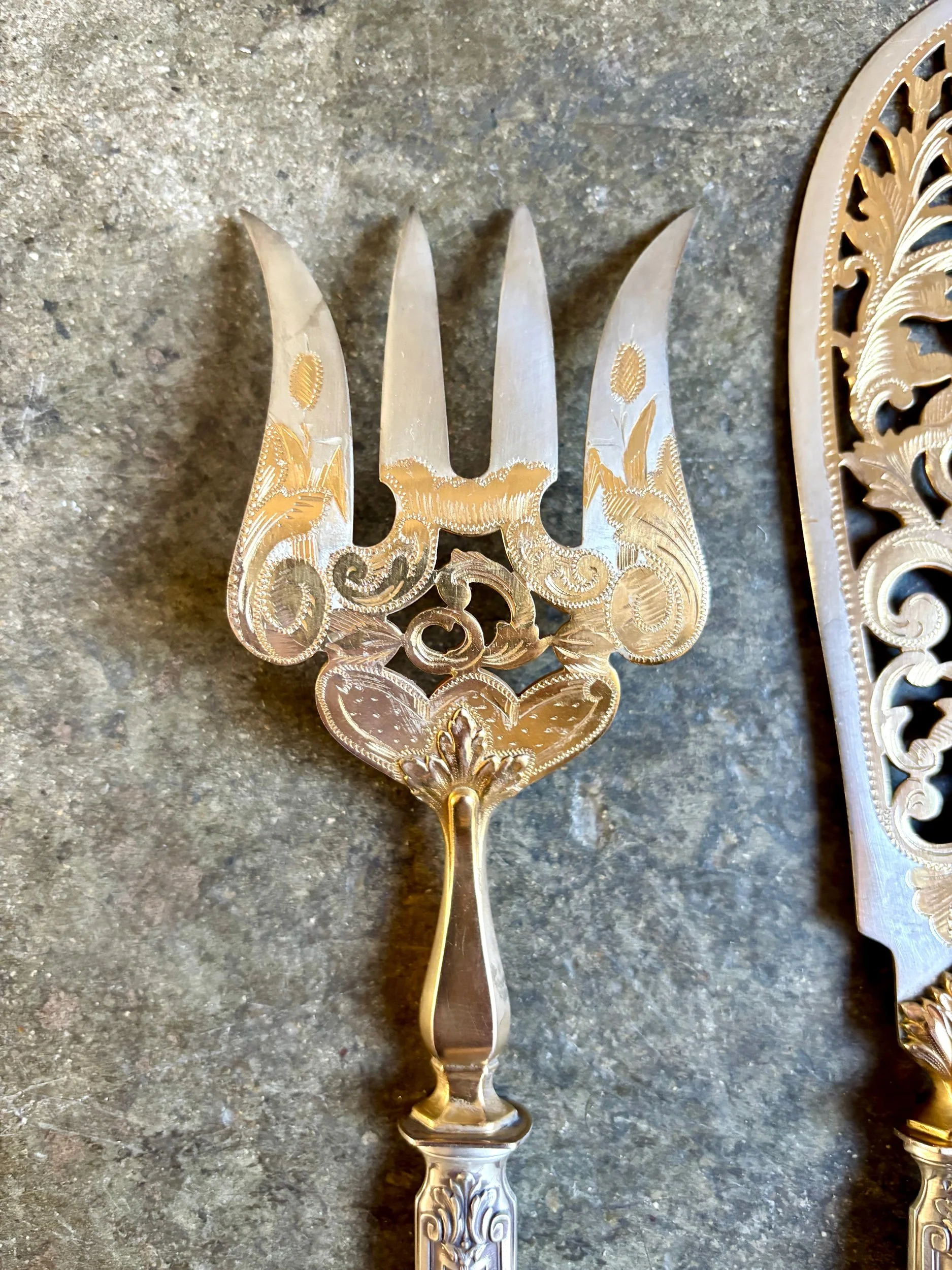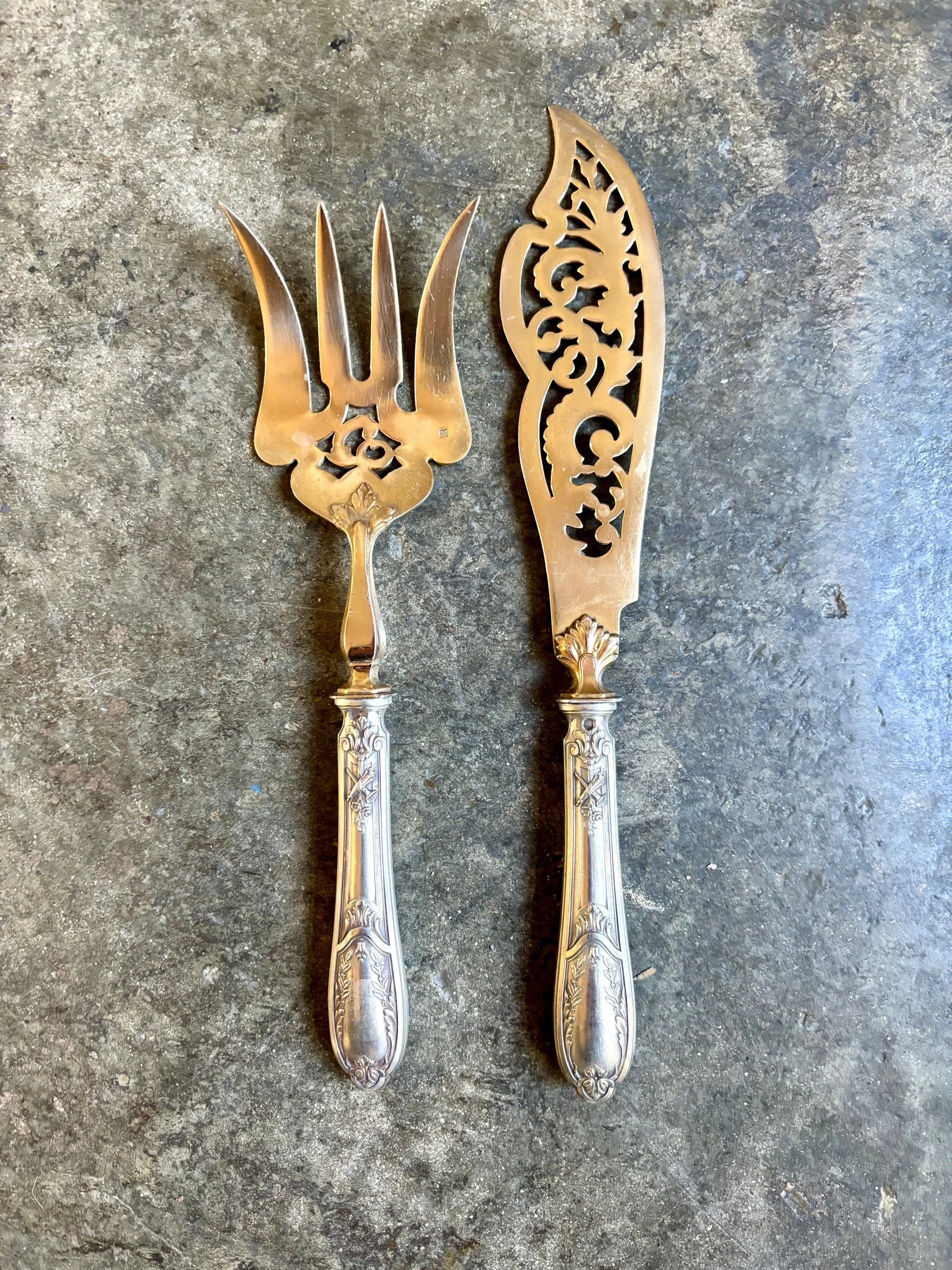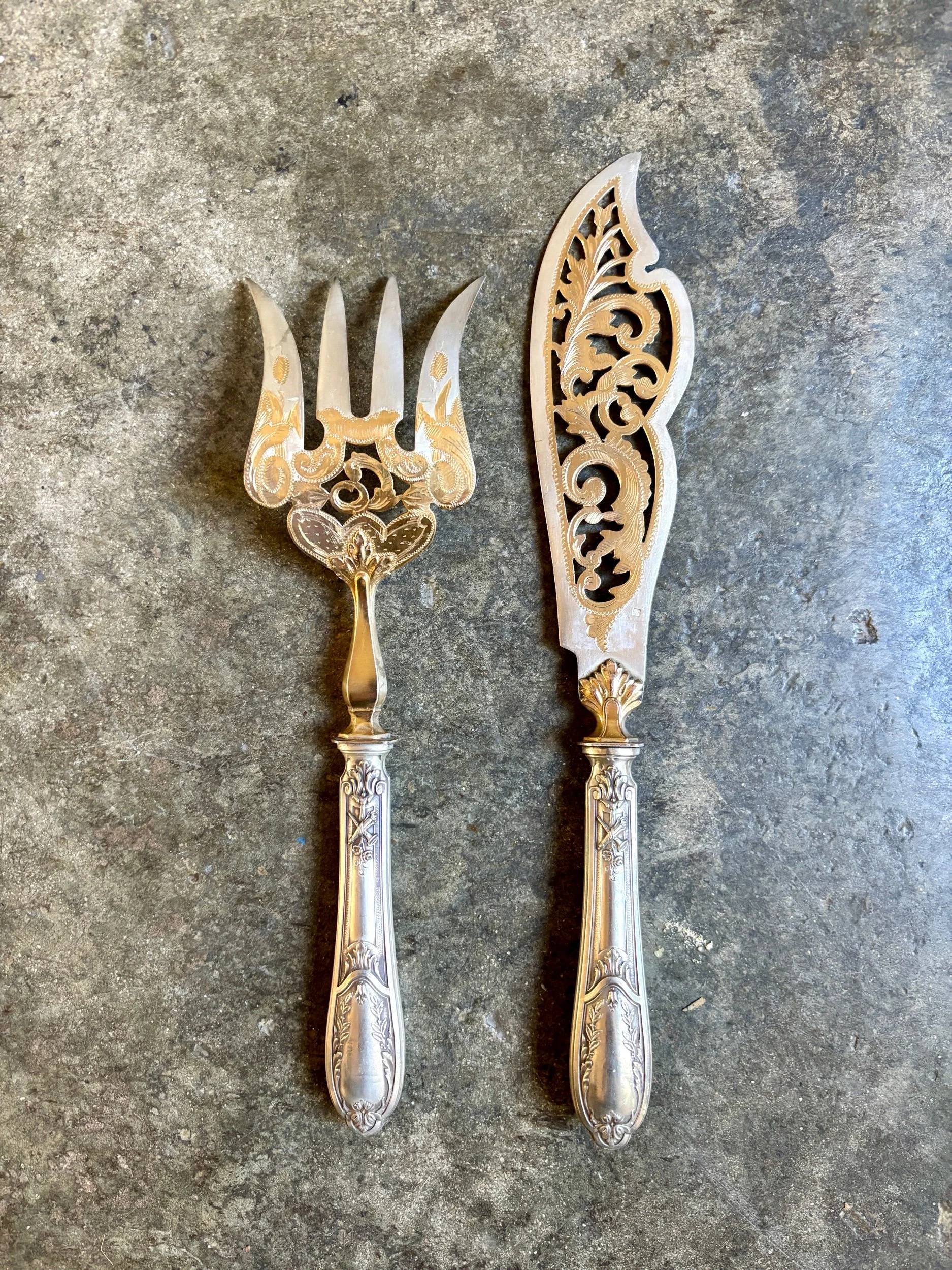Paire de couverts de service à poisson composée d’une fourchette et d’un couteau : chaque manche fourré est en argent massif, martelé et ciselé avec de belles volutes. La fourchette en vermeil à trois dents avec pointes présente de beaux reliefs végétaux et de belles ciselures à volutes ; la lame du couteau de forme libre et en vermeil est lisse et décorée de la même façon.