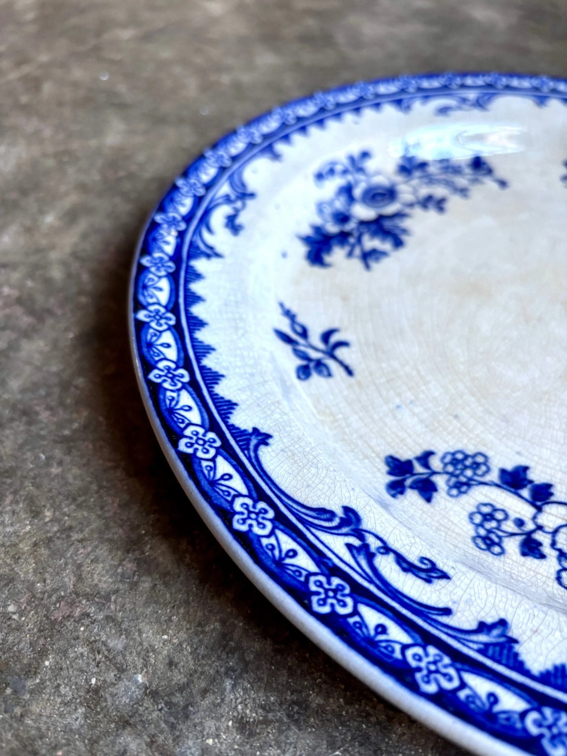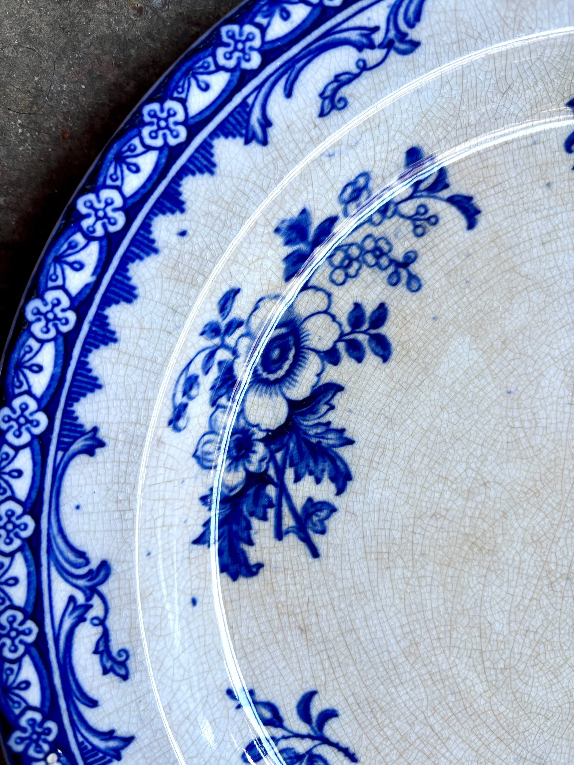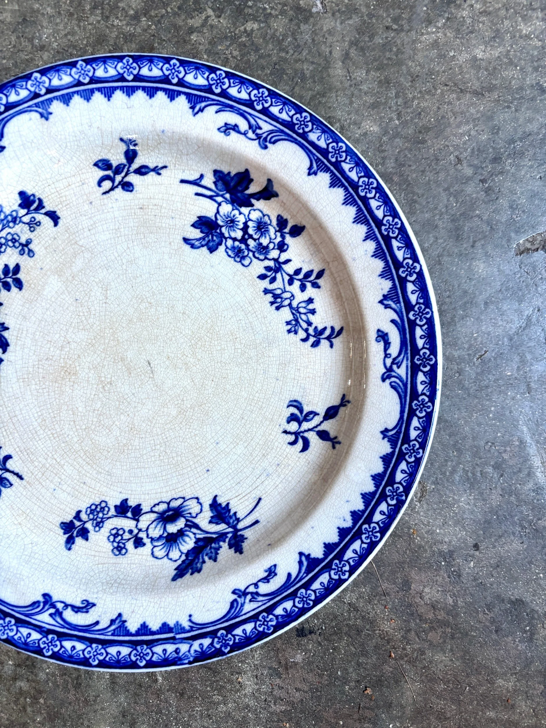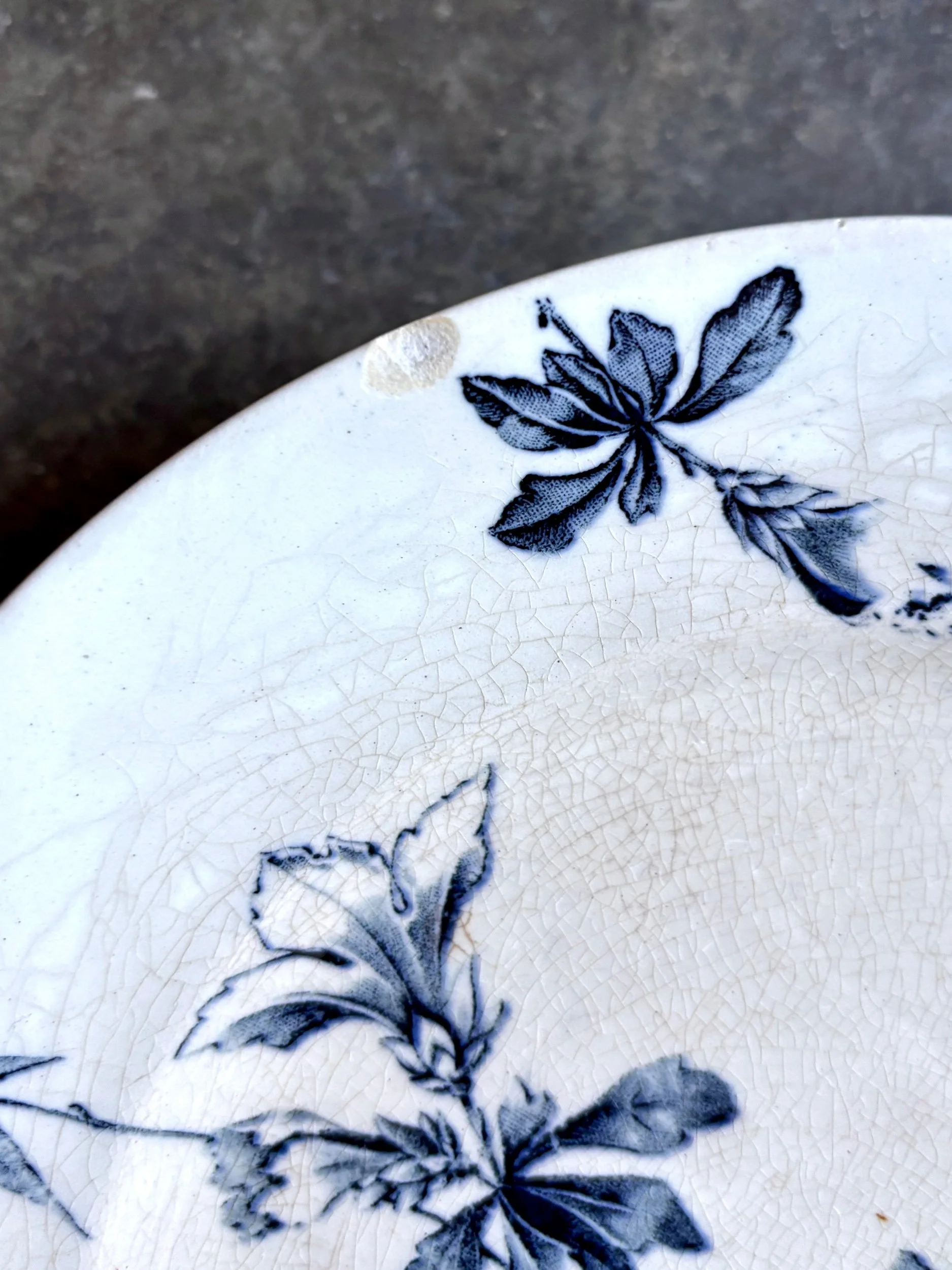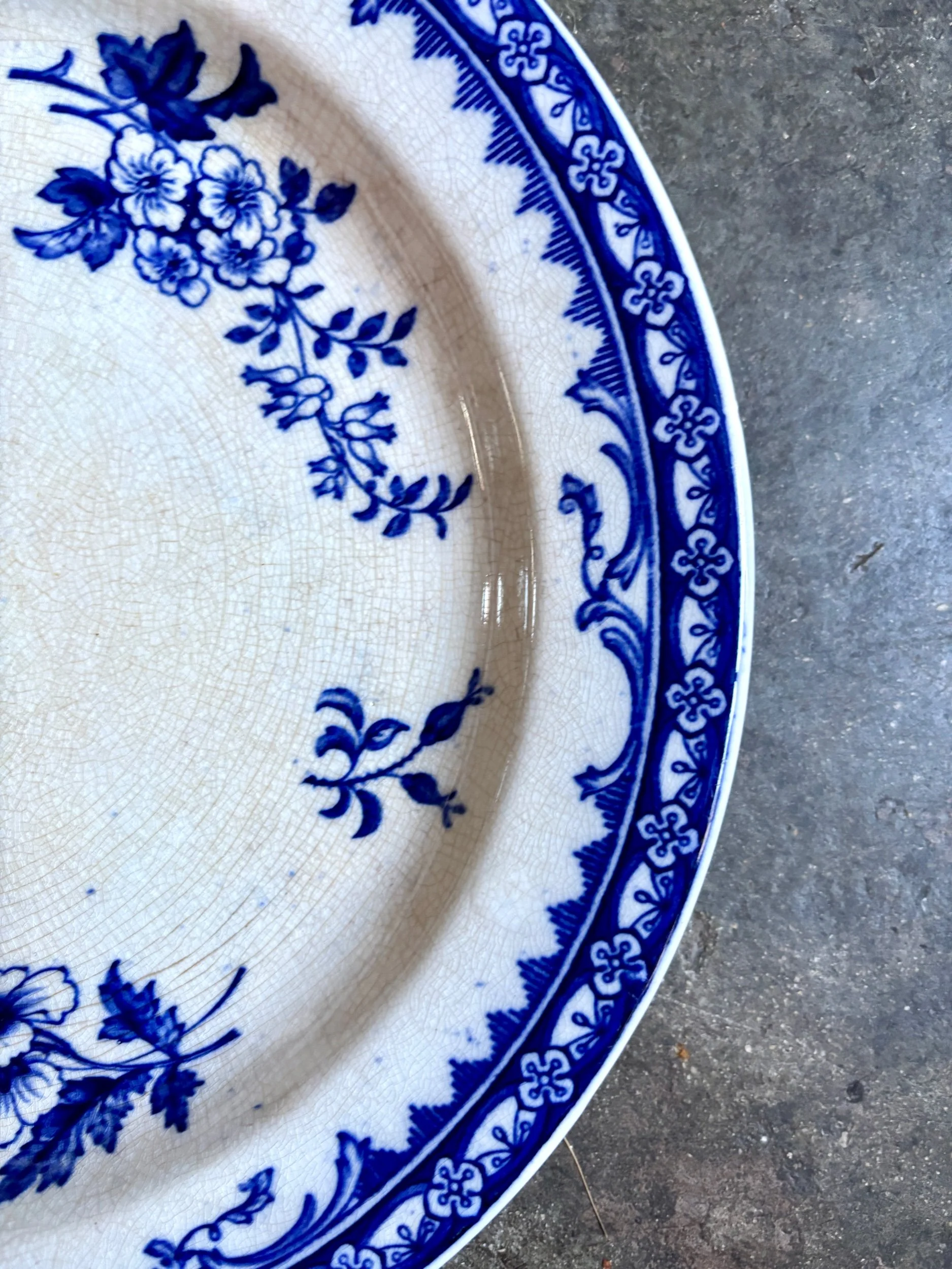 Grand plat rond issu de la manufacture Staffordshire en terre de fer écru et décoré d’une frise florale et géométrique de couleur bleue courant sur le pourtour et d’un motif floral, de même couleur, sur le contenant.