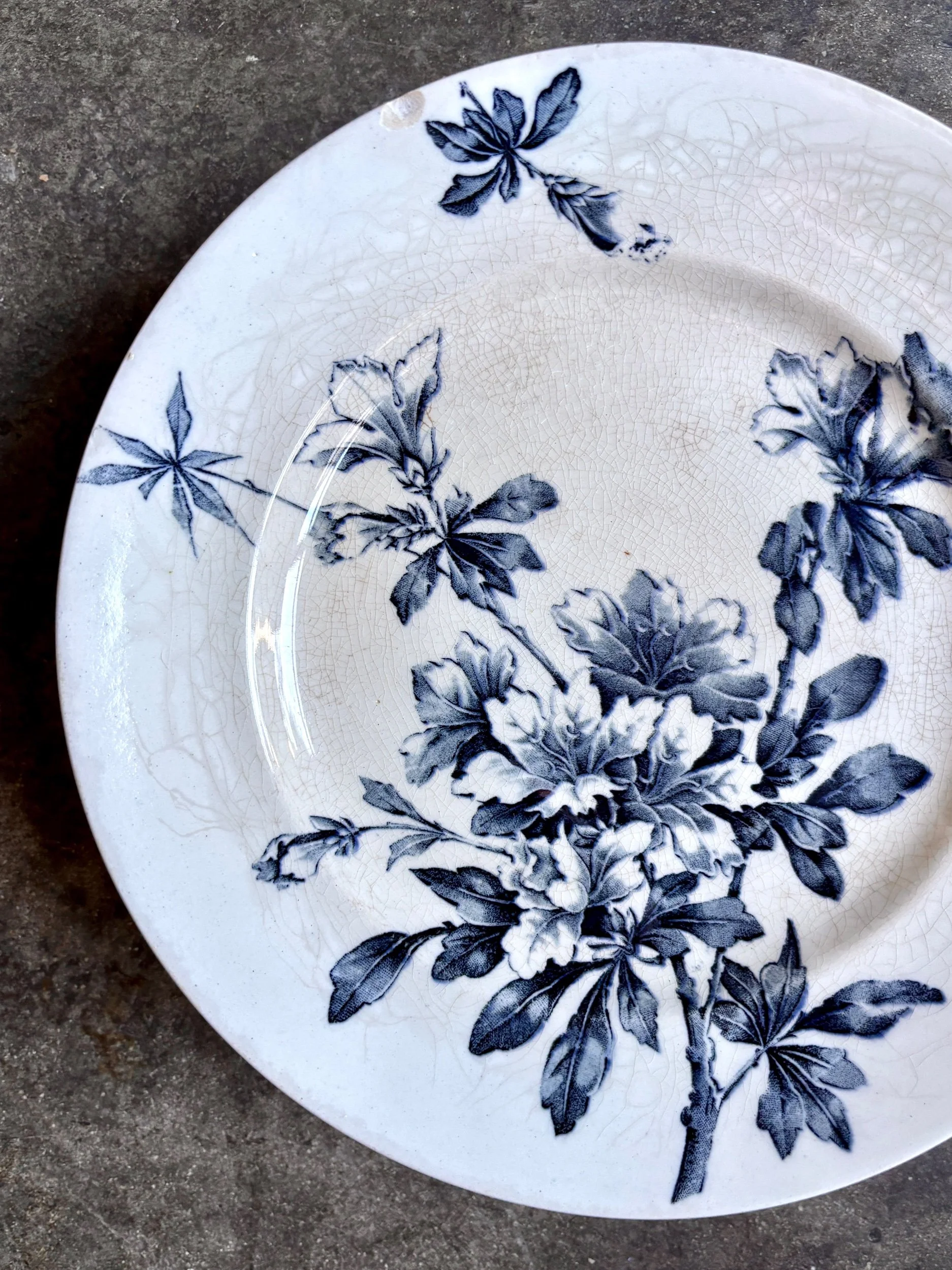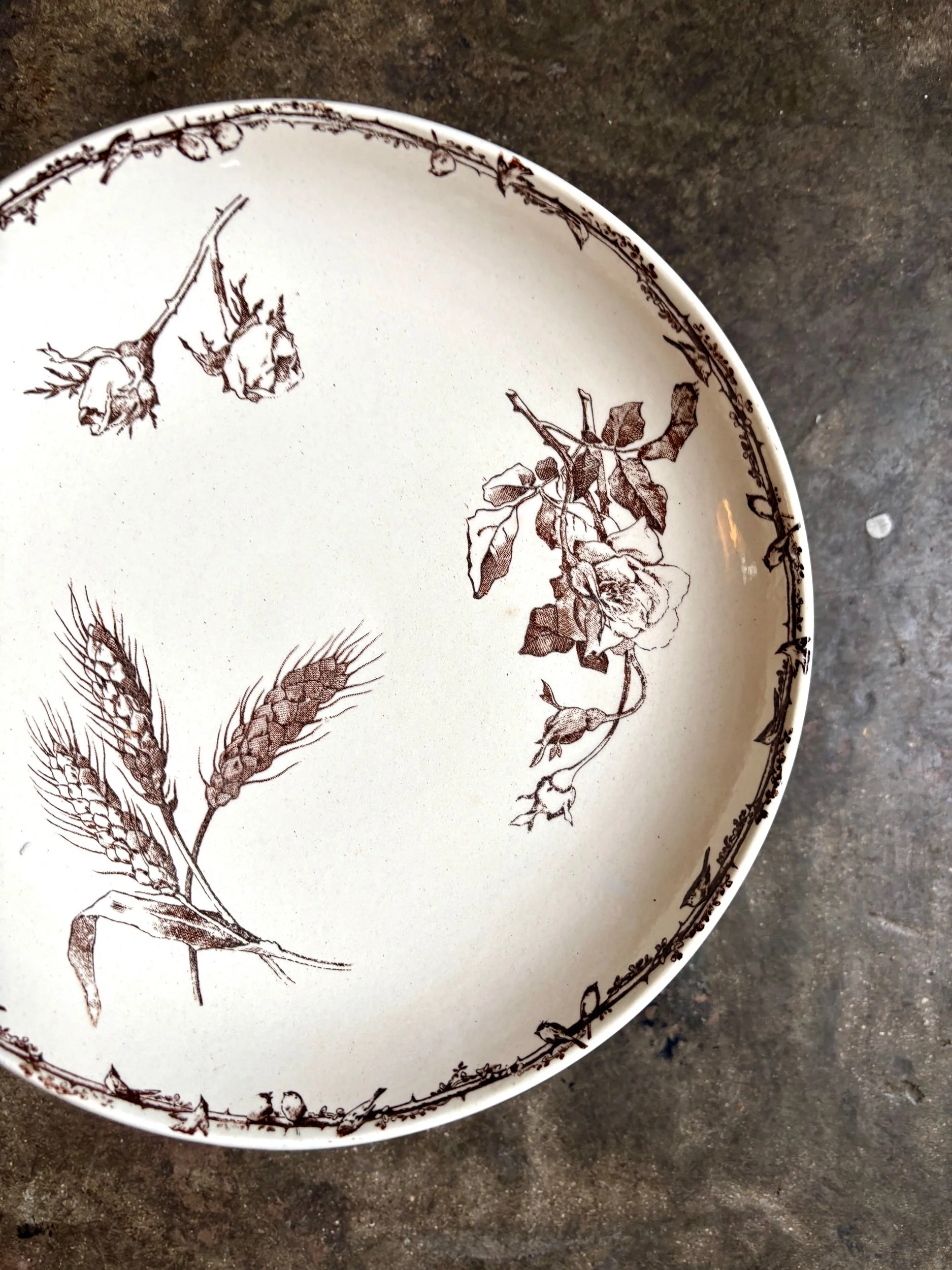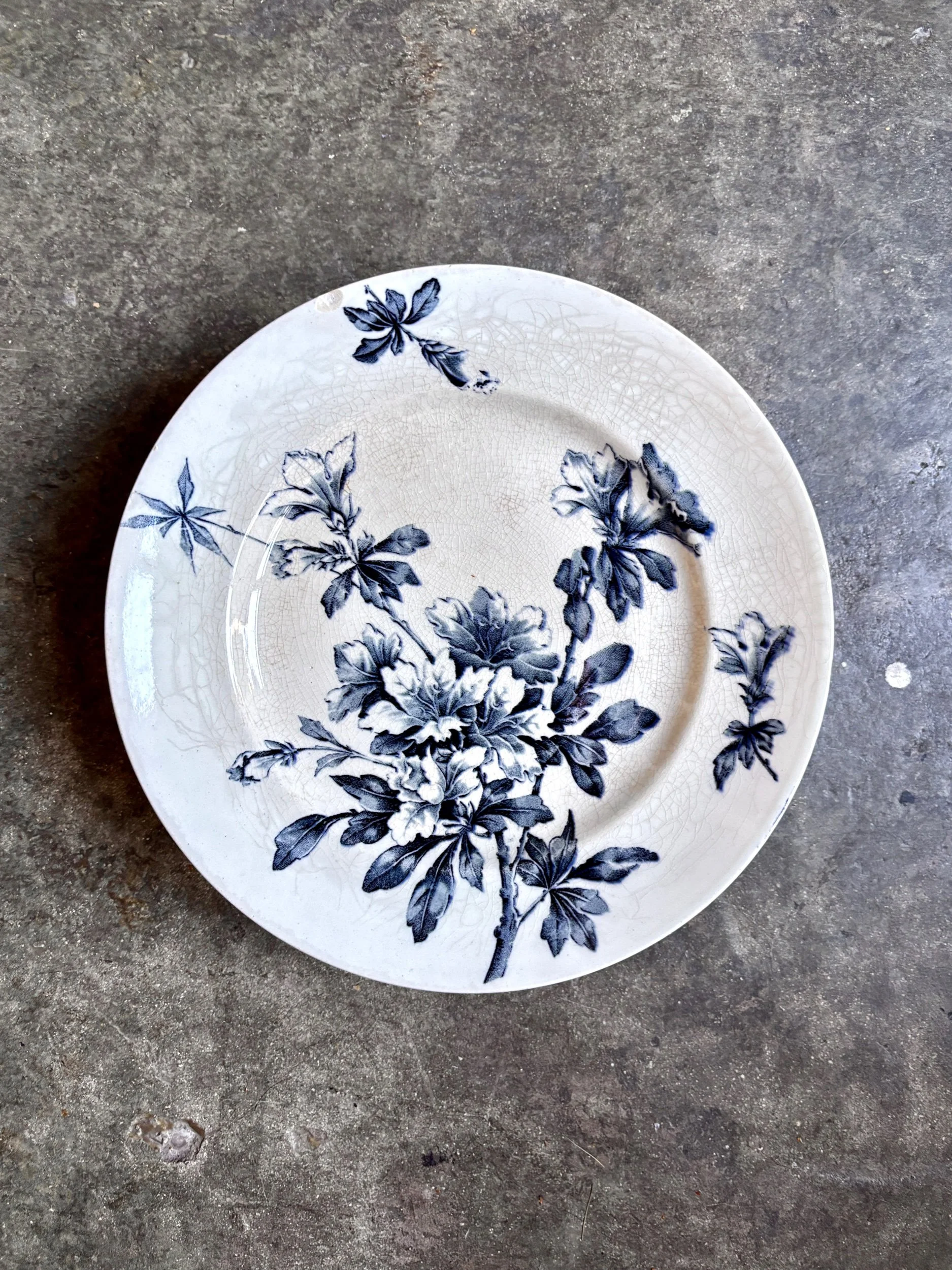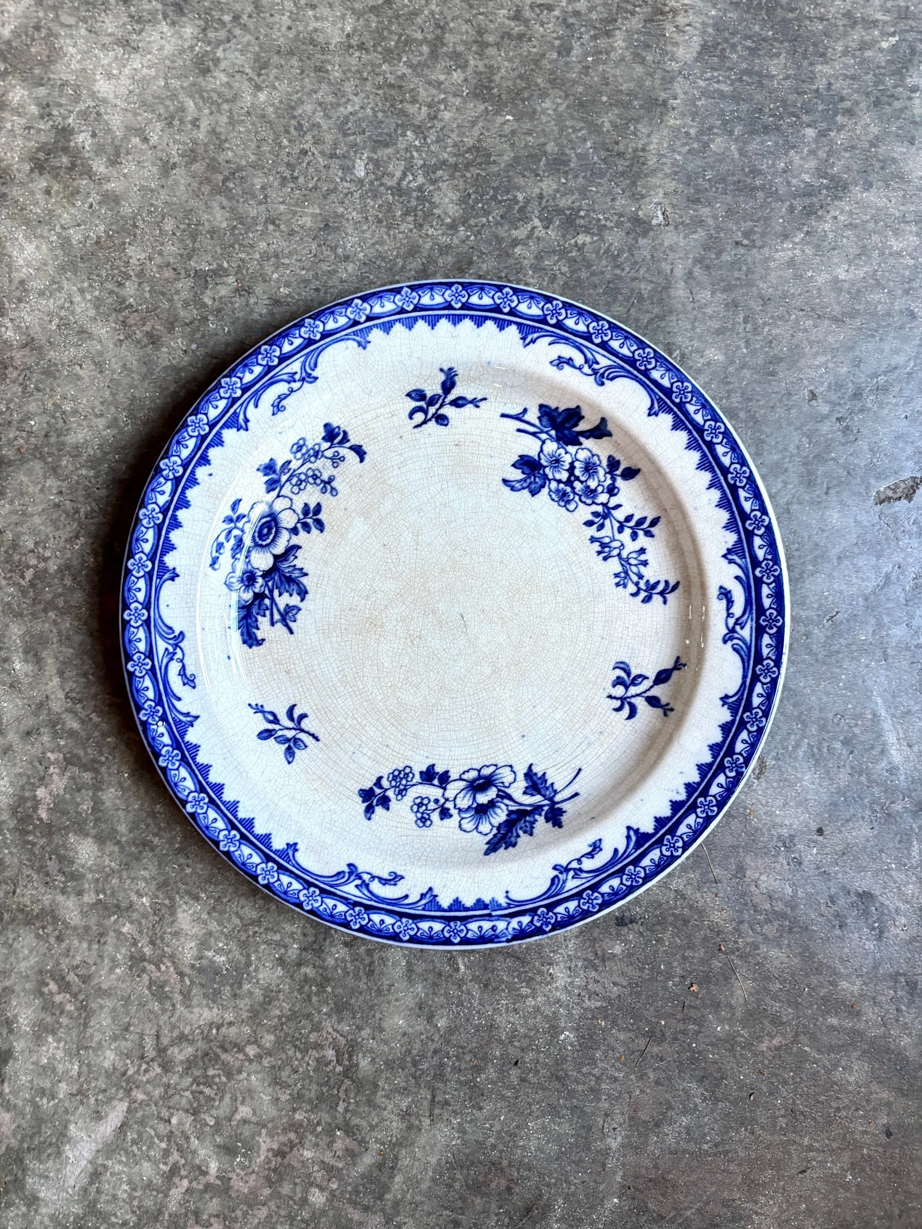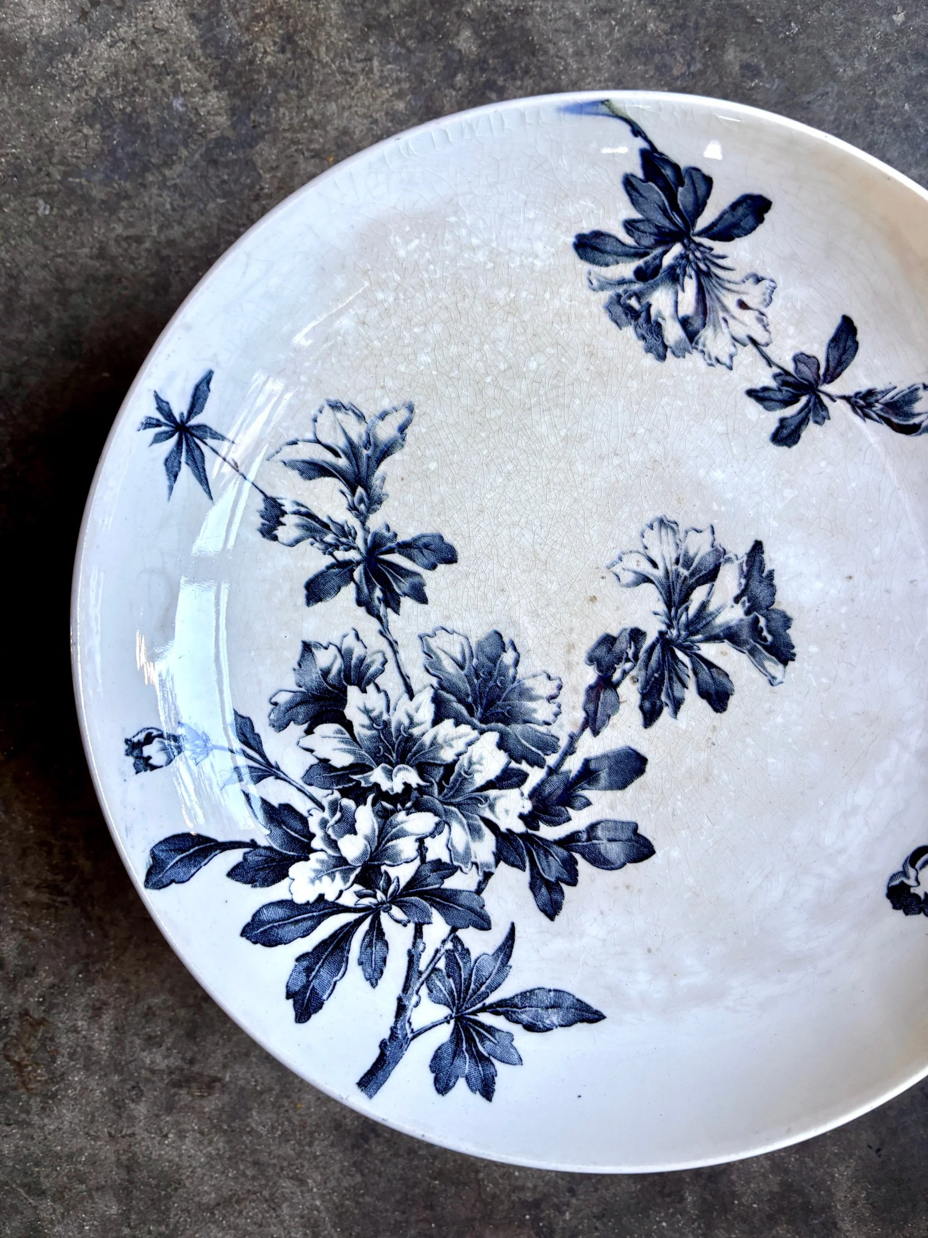 Grand plat rond issu de la manufacture Staffordshire en terre de fer écru et décoré d’une frise florale et géométrique de couleur bleue courant sur le pourtour et d’un motif floral, de même couleur, sur le contenant.