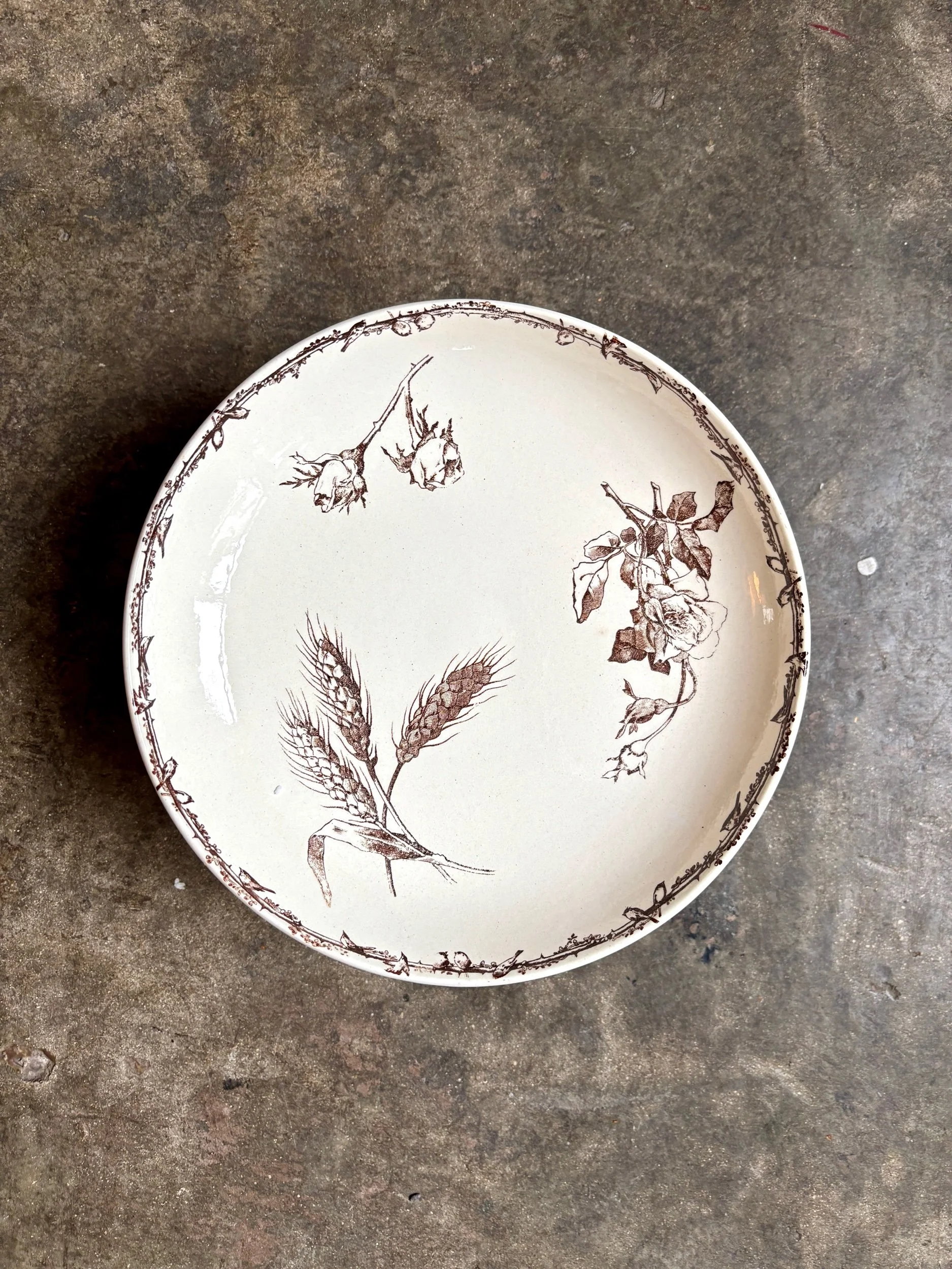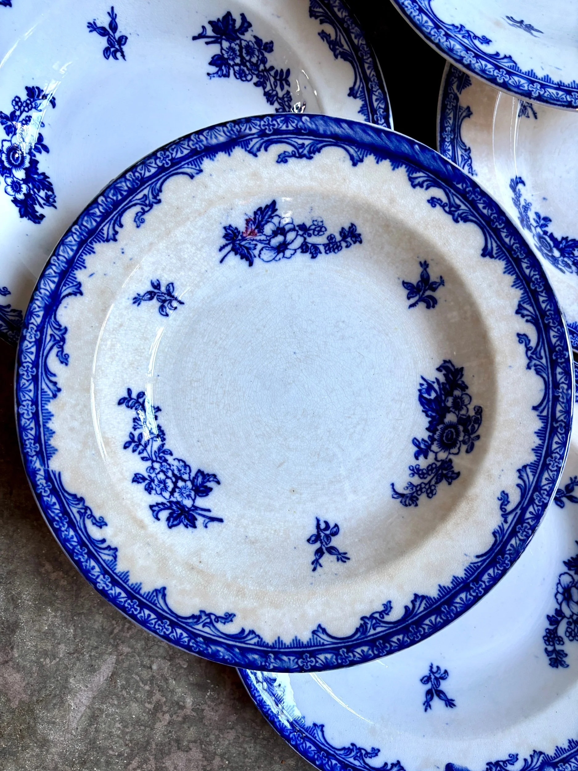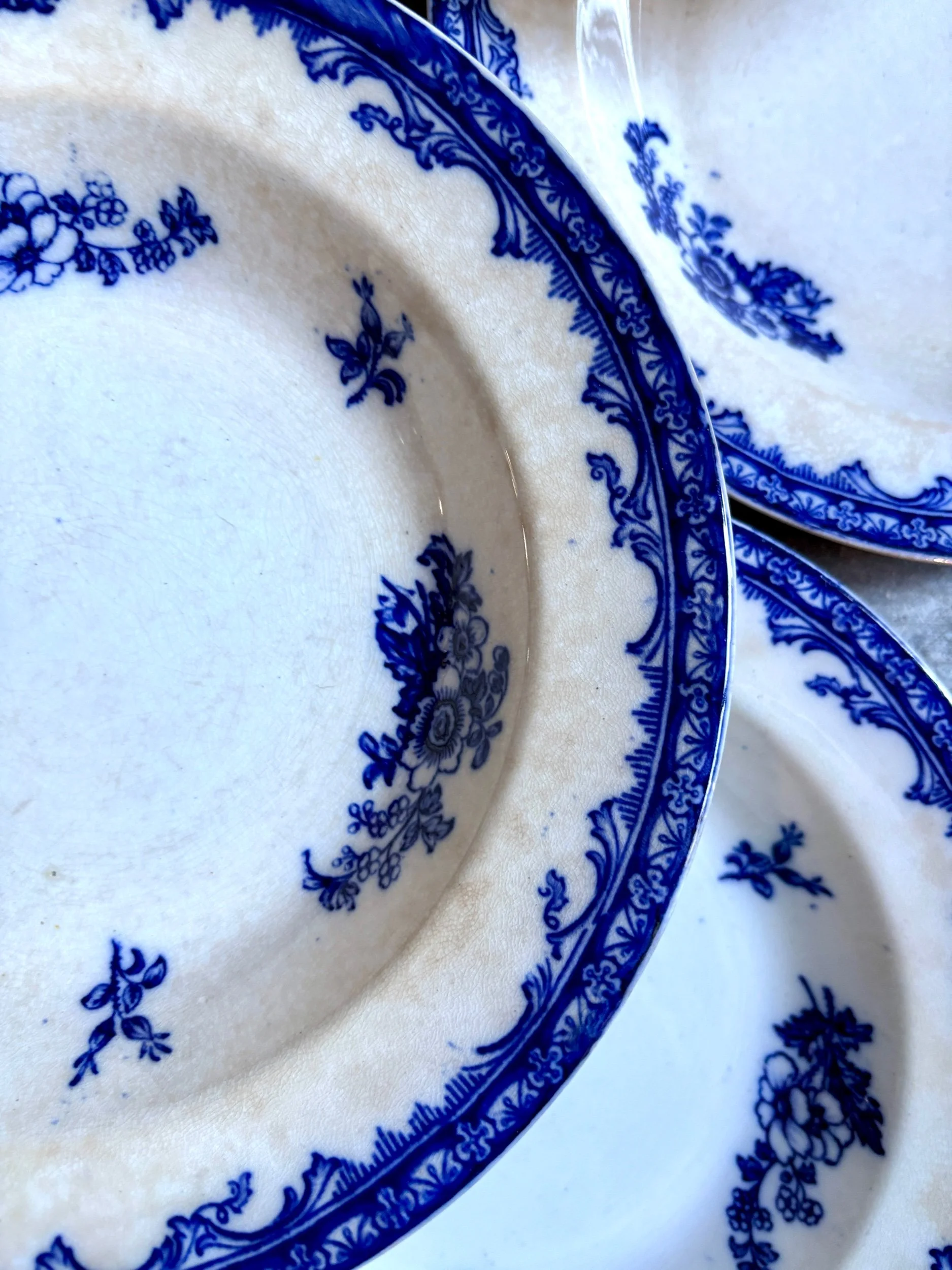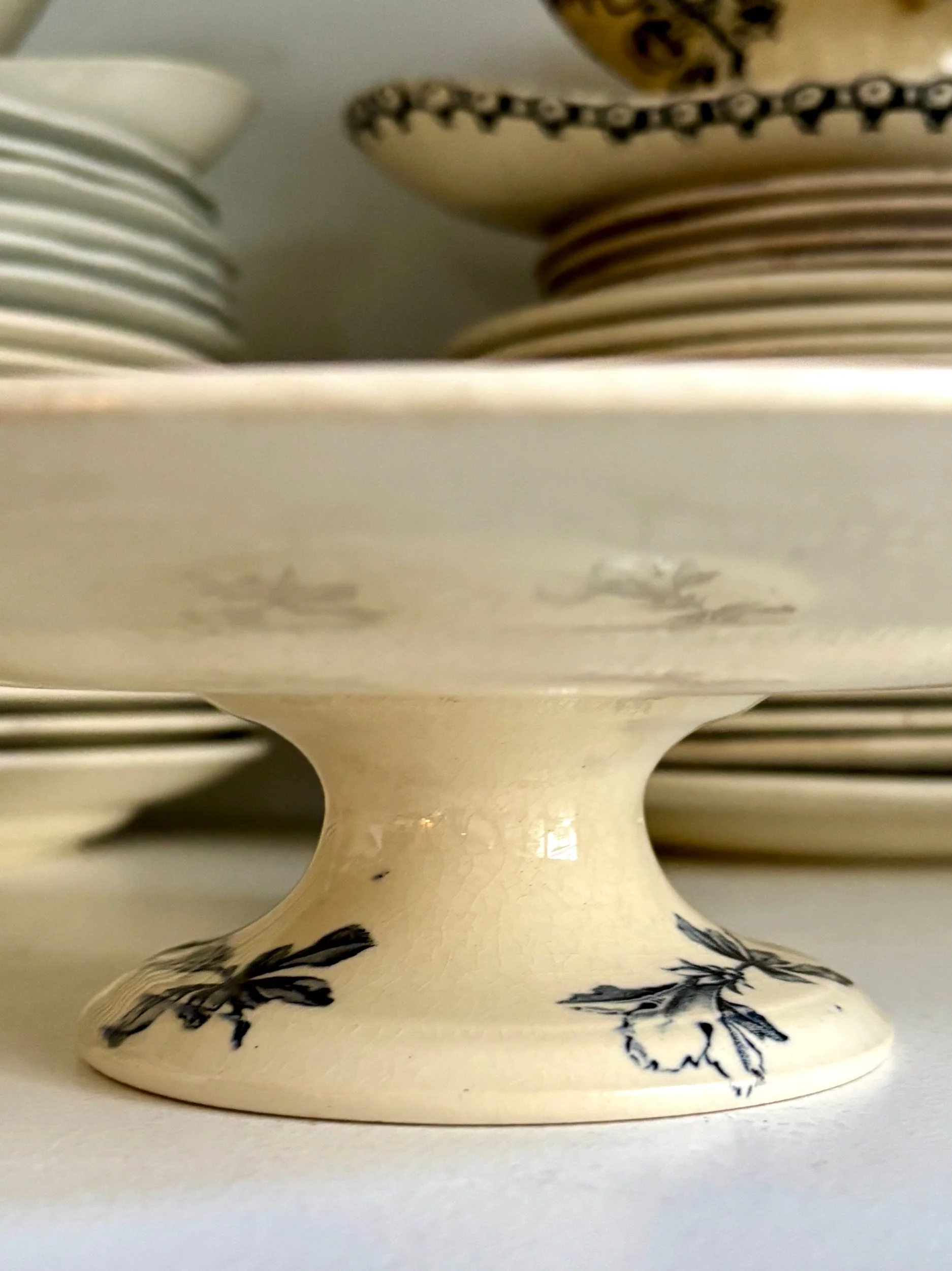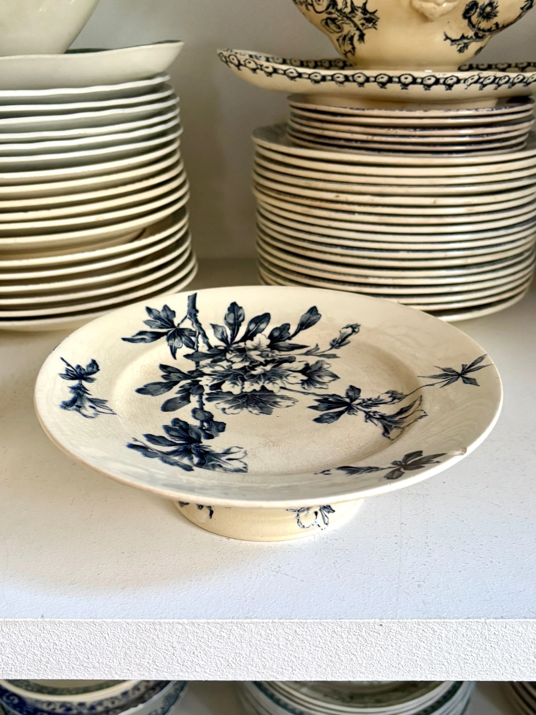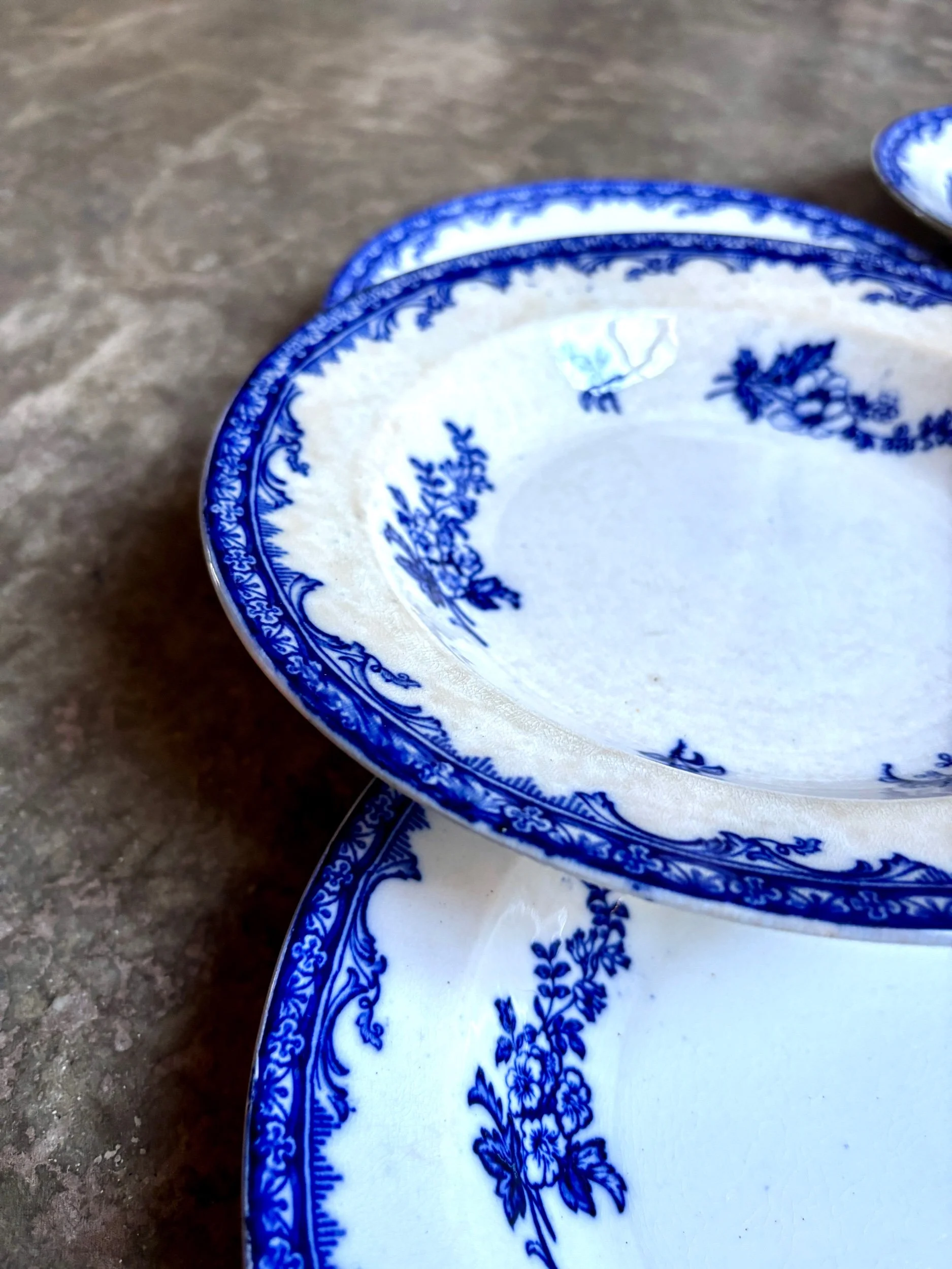 Grand plat rond issu de la manufacture Staffordshire en terre de fer écru et décoré d’une frise florale et géométrique de couleur bleue courant sur le pourtour et d’un motif floral, de même couleur, sur le contenant.