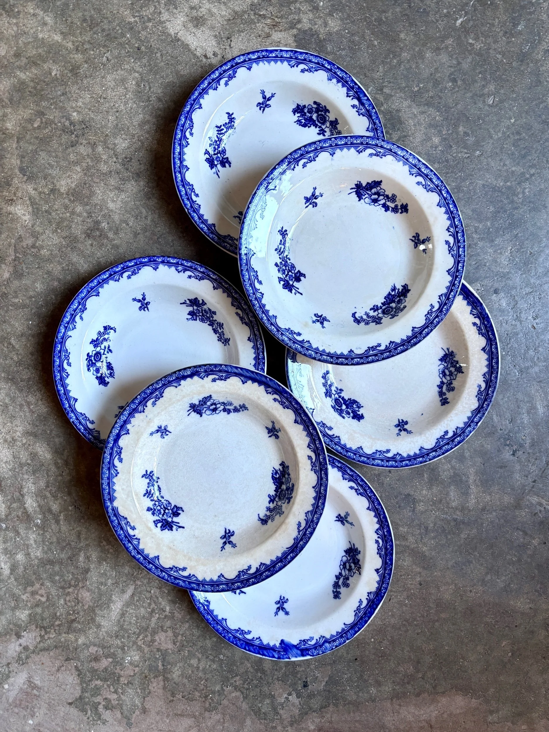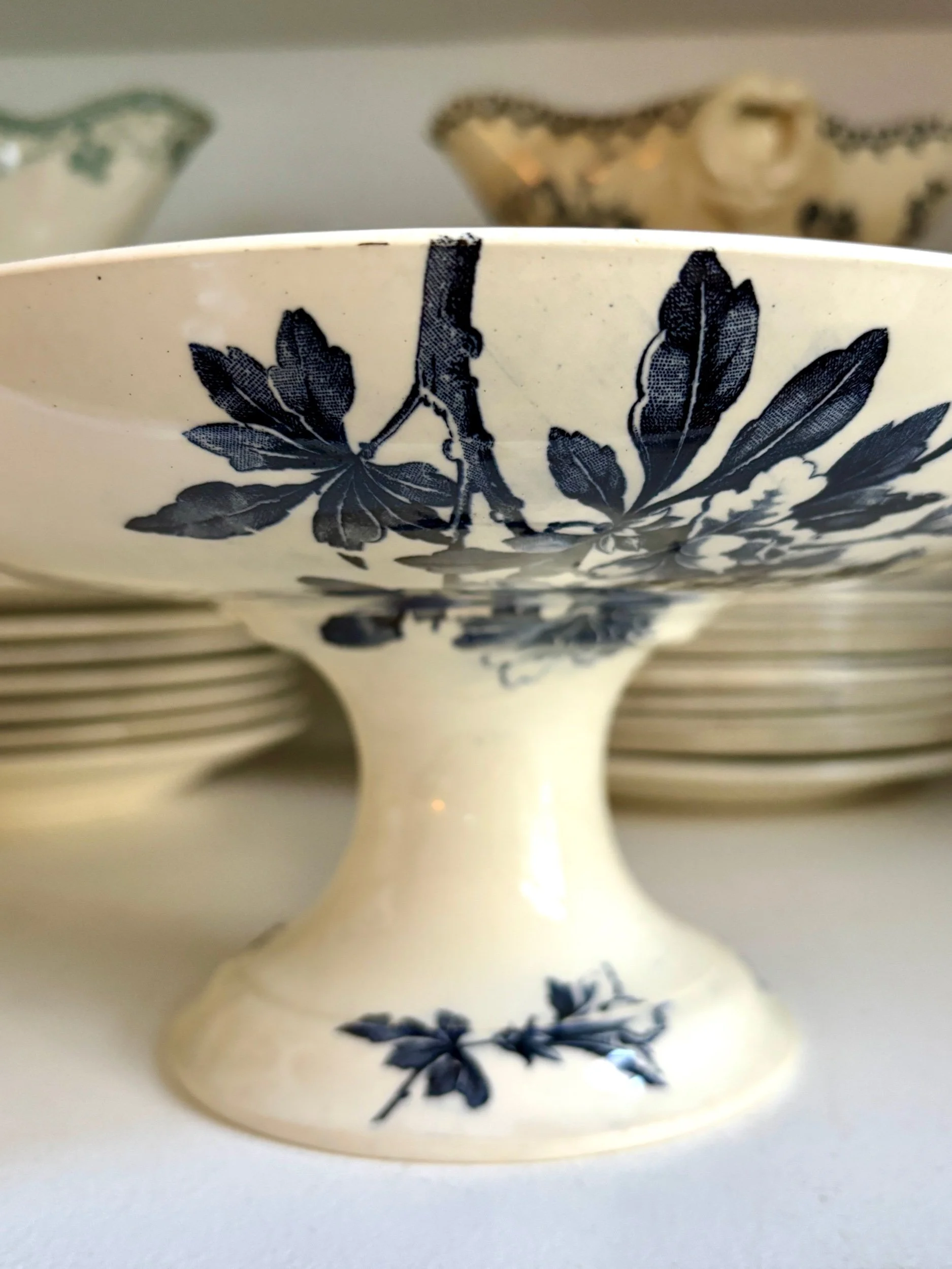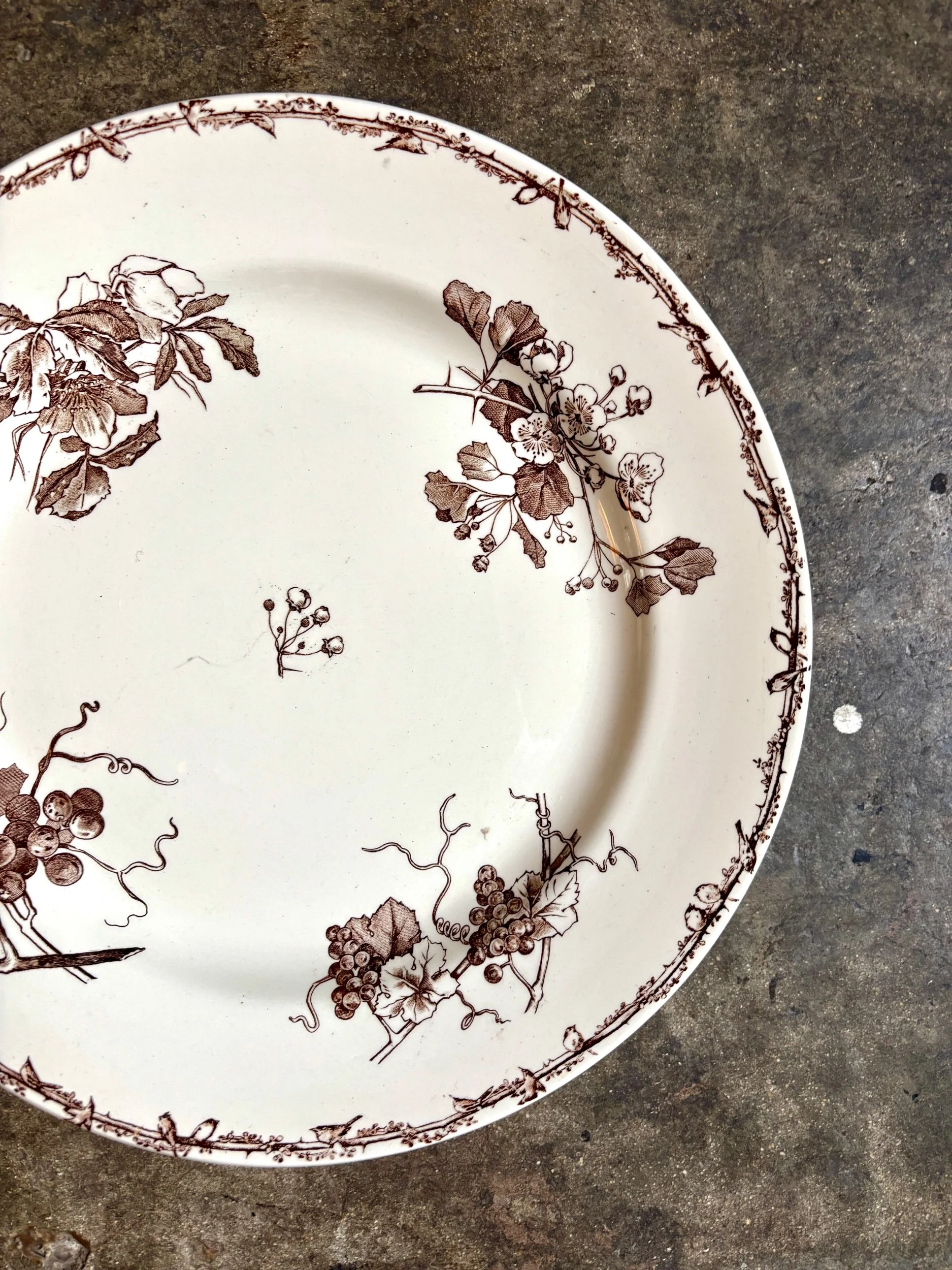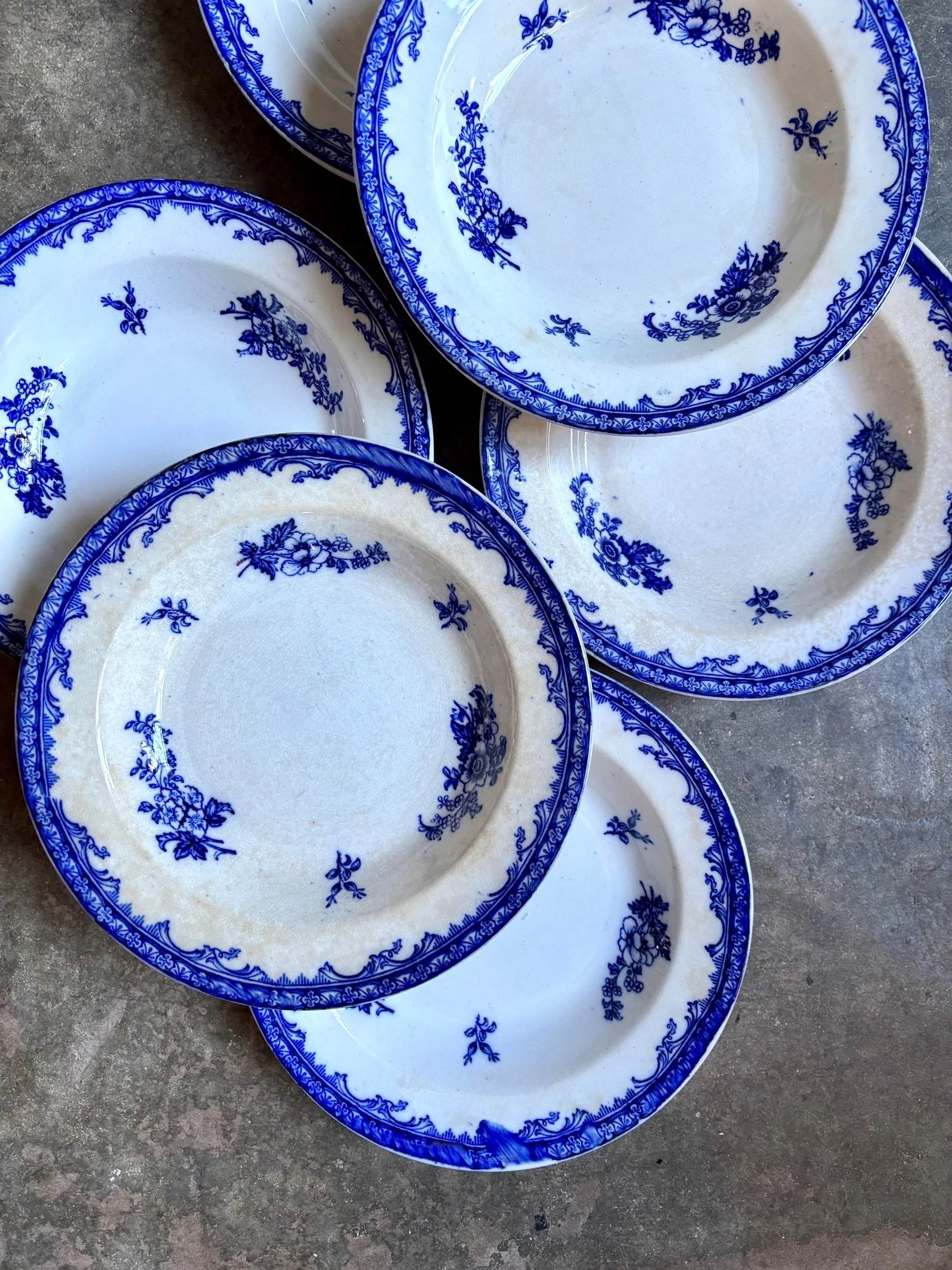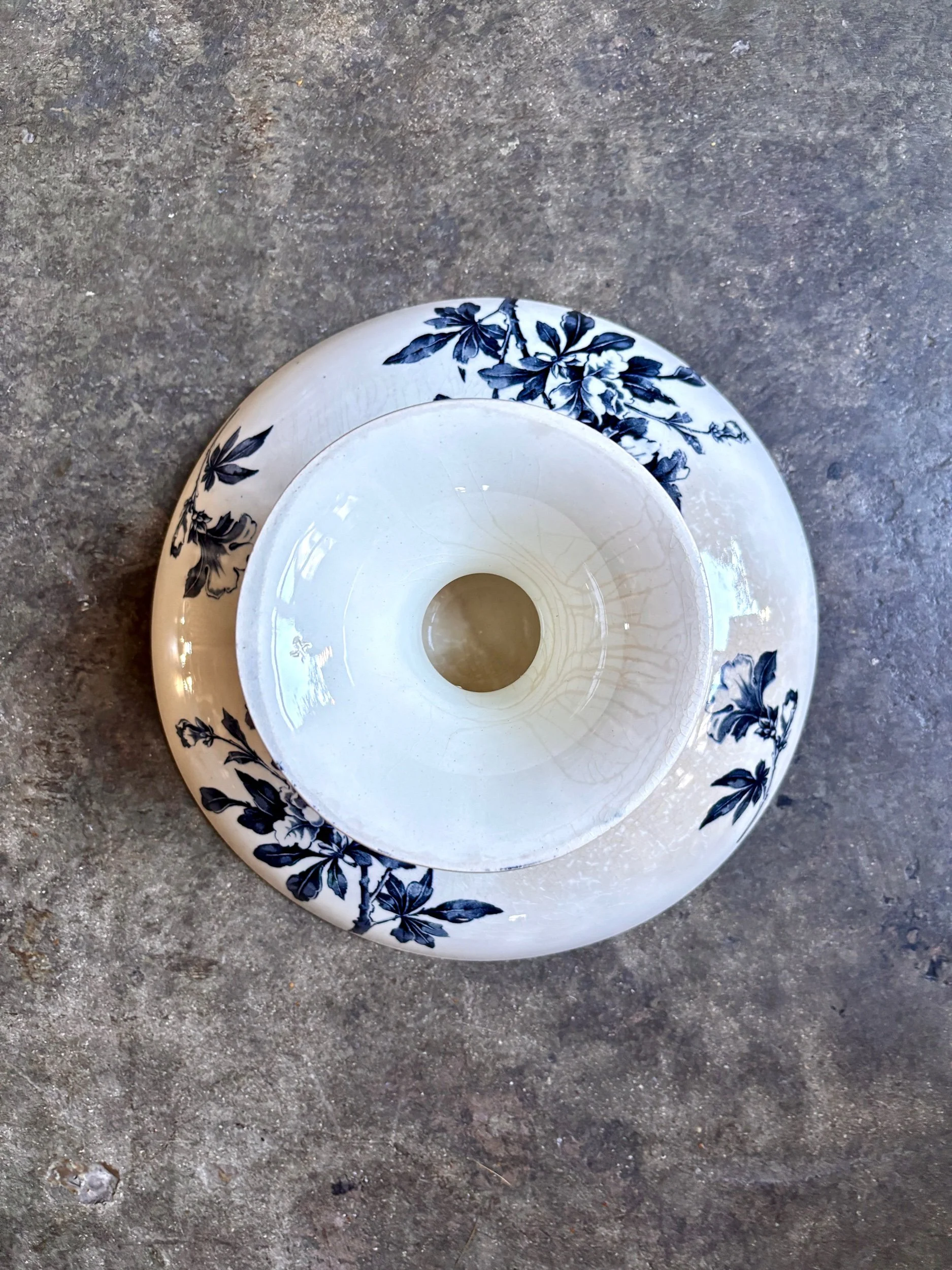 Grand plat rond issu de la manufacture Staffordshire en terre de fer écru et décoré d’une frise florale et géométrique de couleur bleue courant sur le pourtour et d’un motif floral, de même couleur, sur le contenant.