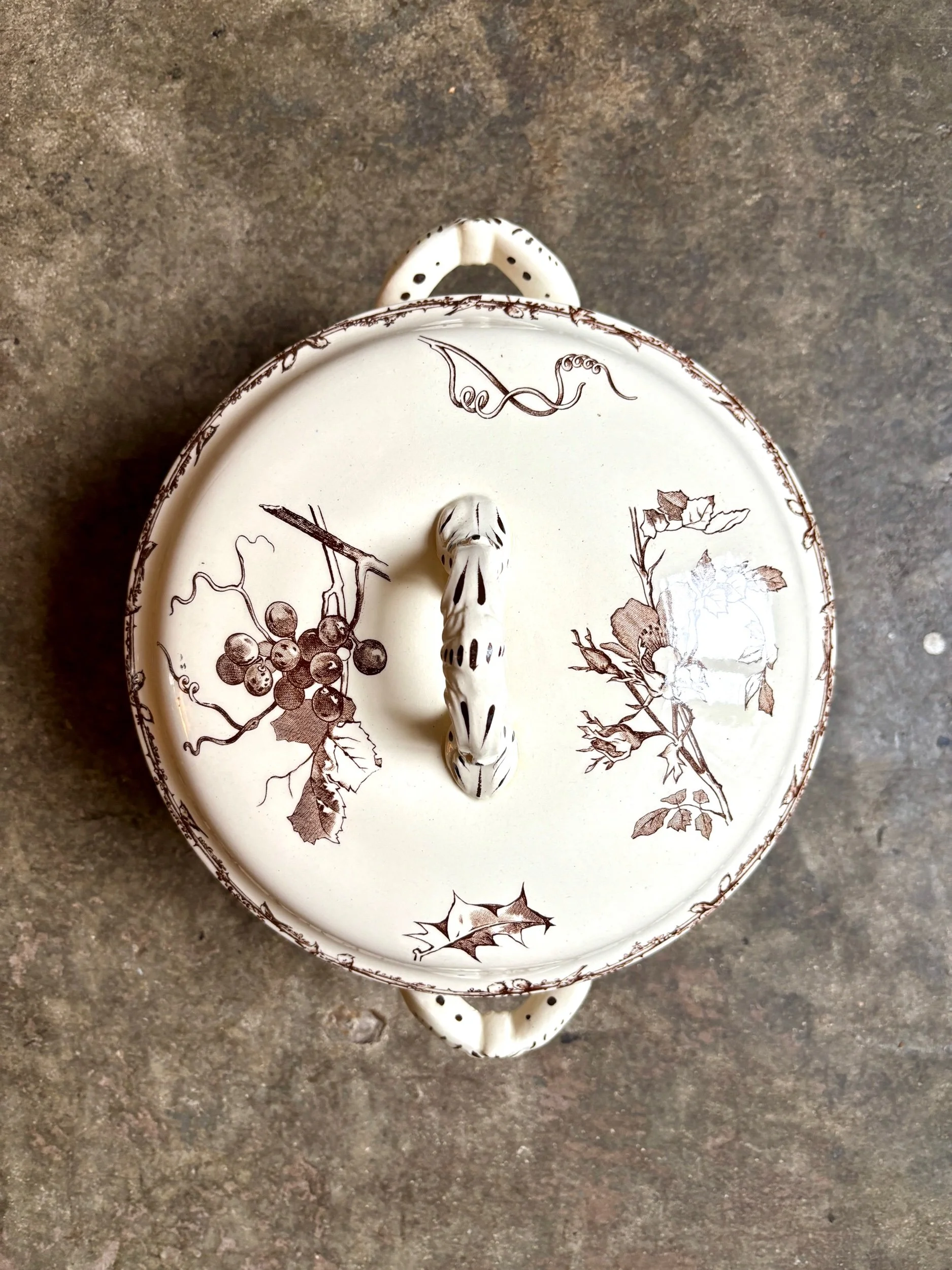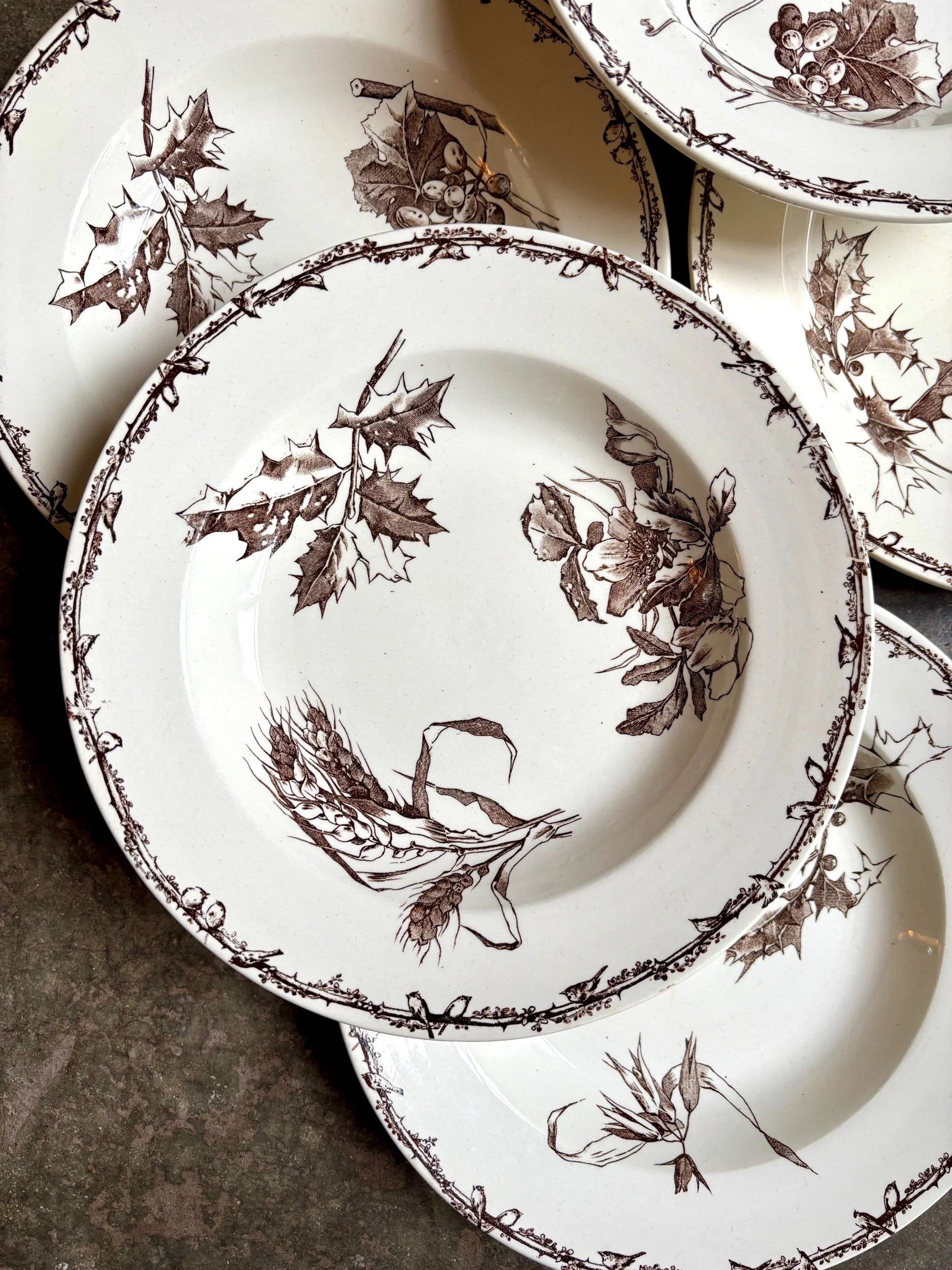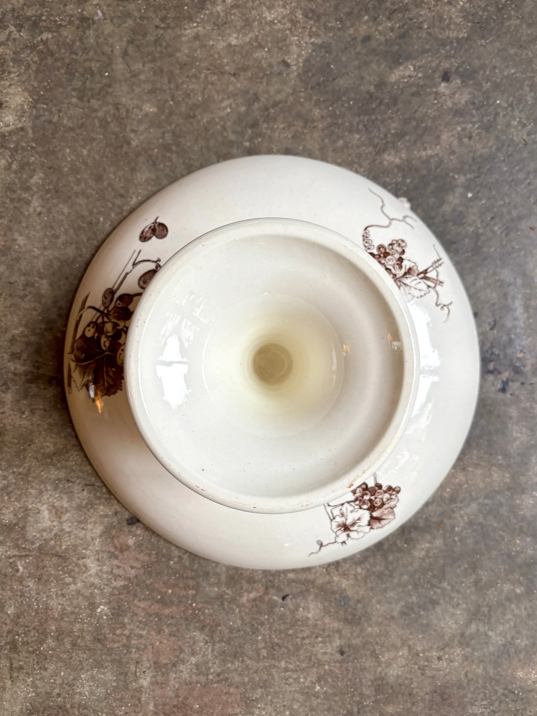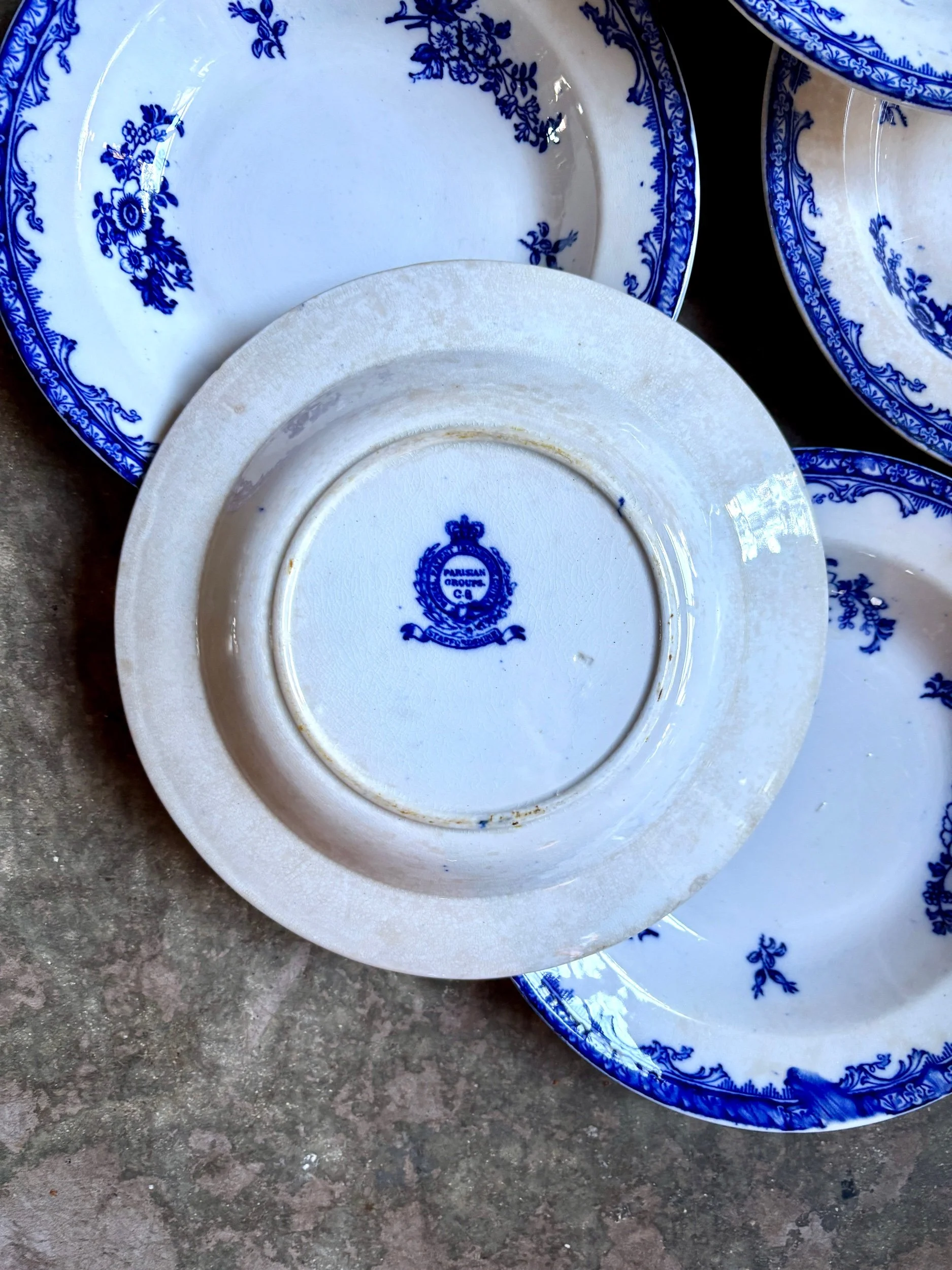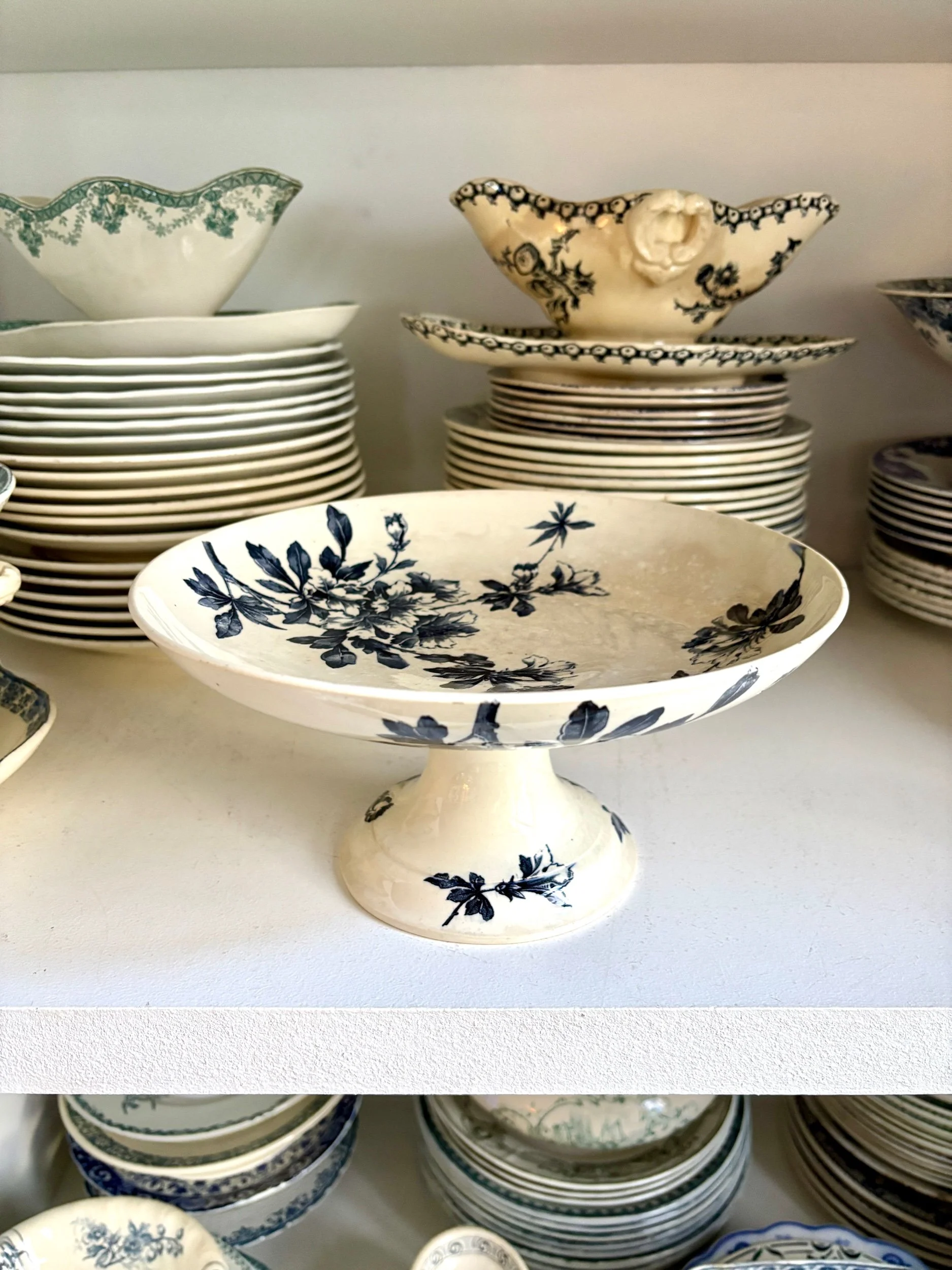 Grand plat rond issu de la manufacture Staffordshire en terre de fer écru et décoré d’une frise florale et géométrique de couleur bleue courant sur le pourtour et d’un motif floral, de même couleur, sur le contenant.
