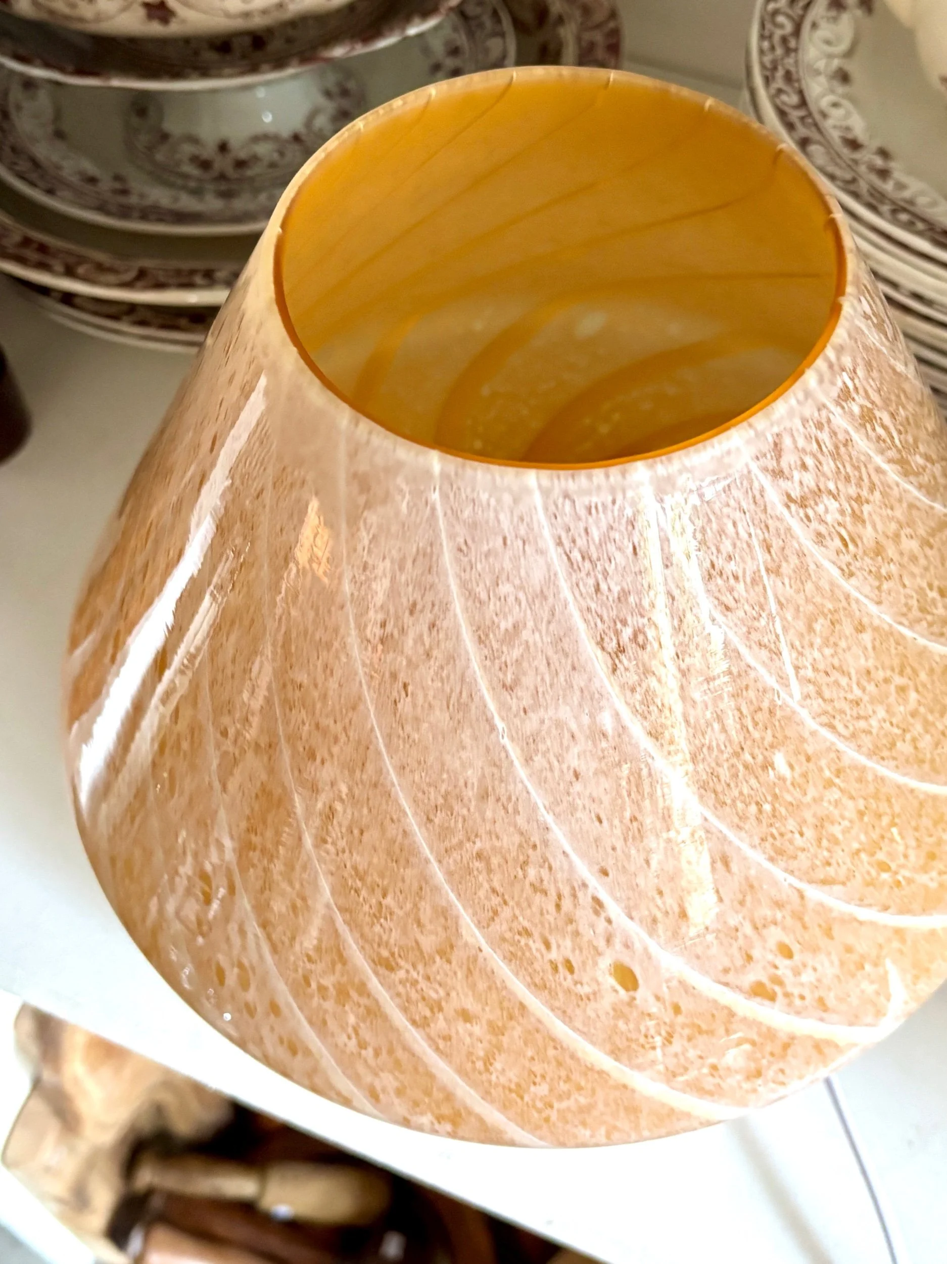 Lampe de table champignon en verre de Murano monobloc aux nuances orange et mouchetée de blanc.