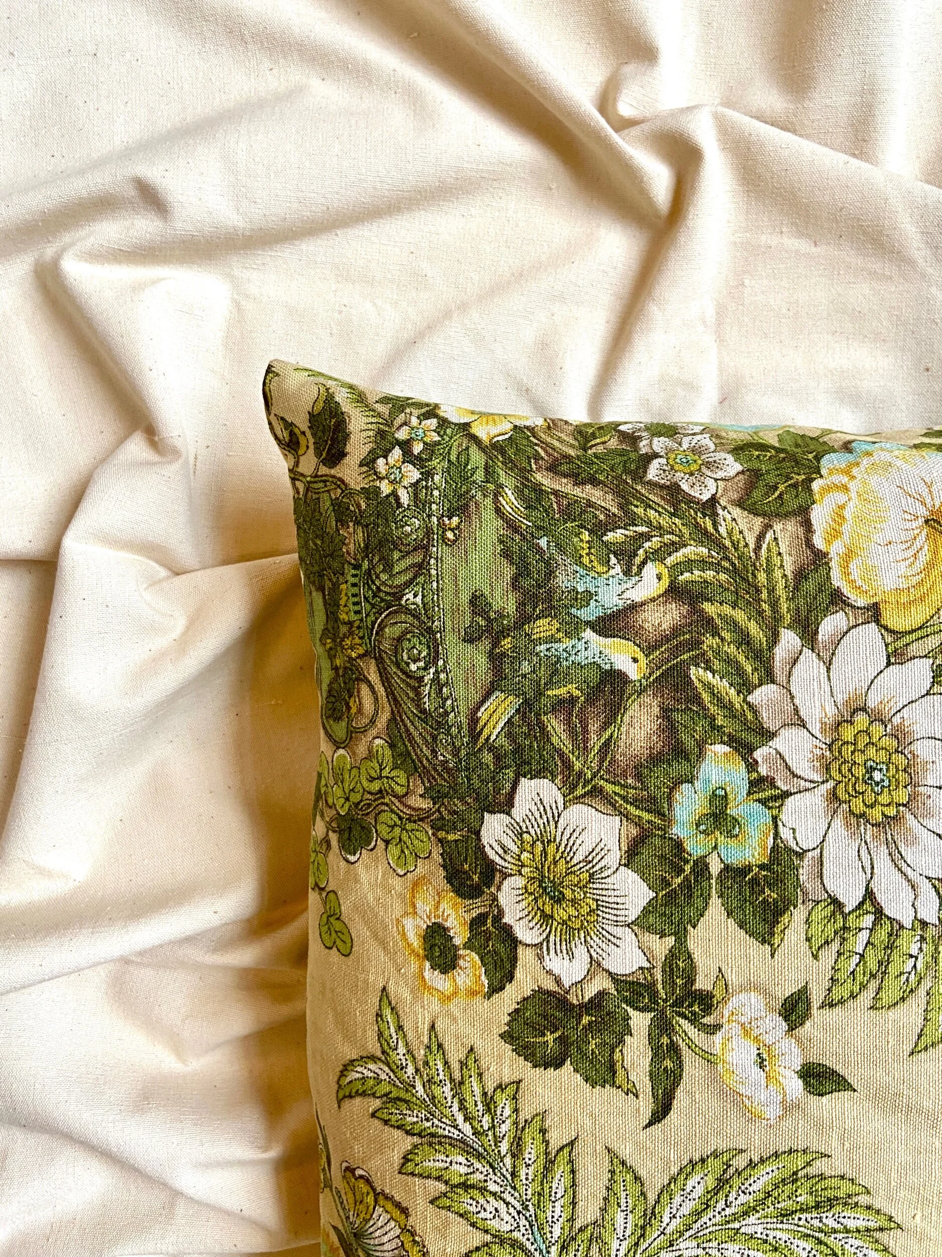 Coussin upcyclé de forme carrée en coton imprimé avec vase Médicis, végétation et oiseaux sur fond beige cousu en porte-feuille et proposé avec sa garniture en plumes de canards recyclées. Un motif à l’horizontal et un à la verticale sont proposés pour ces coussins.