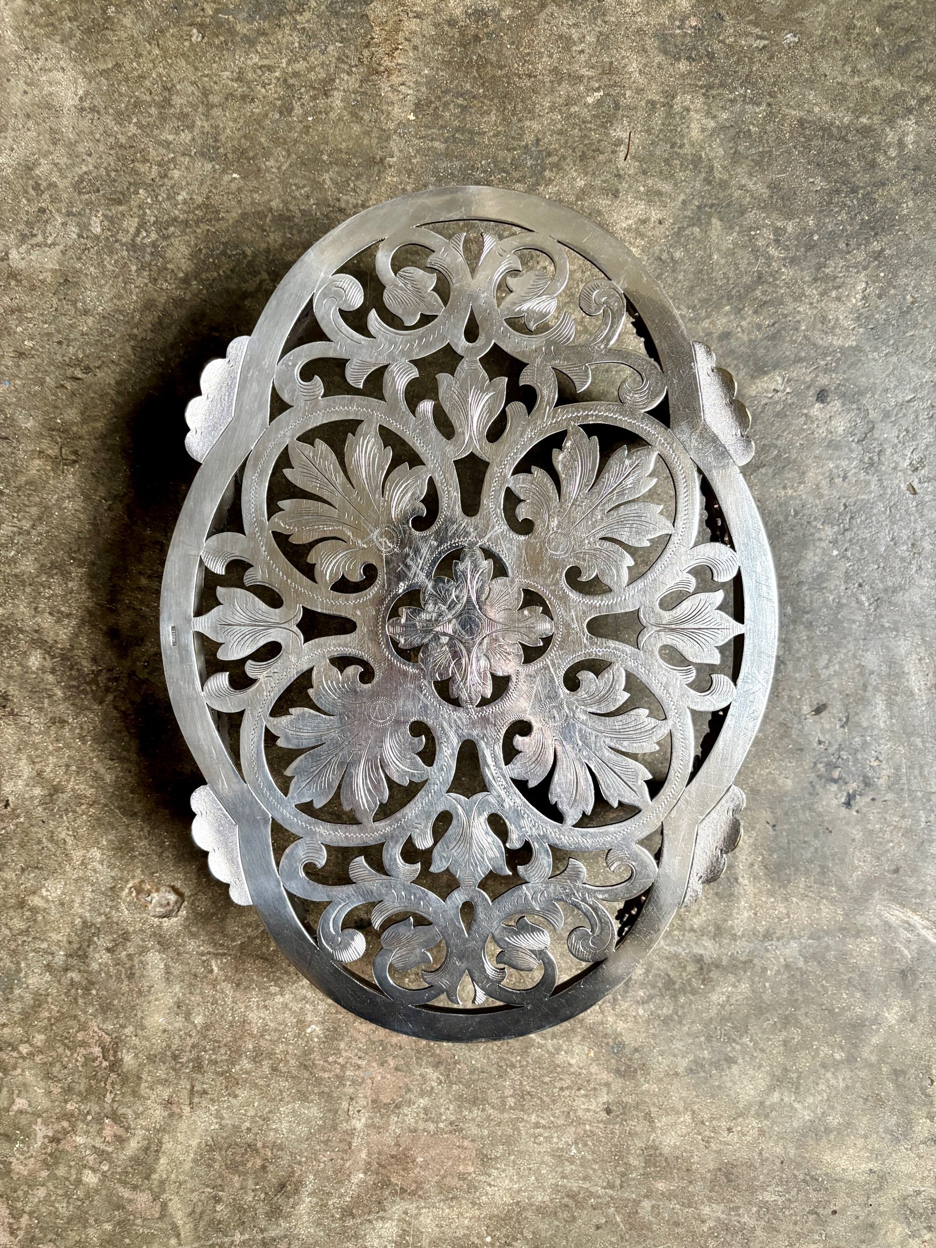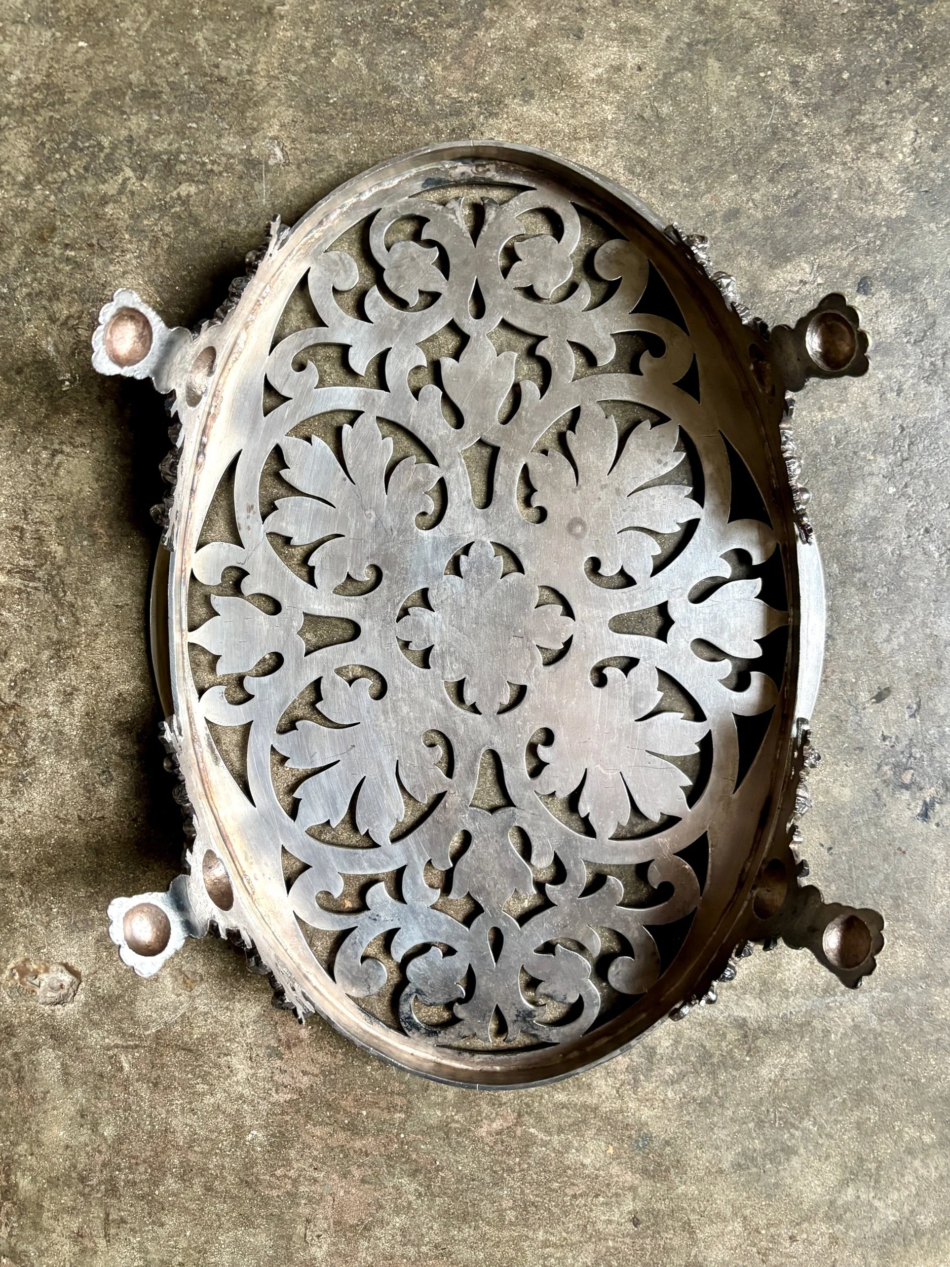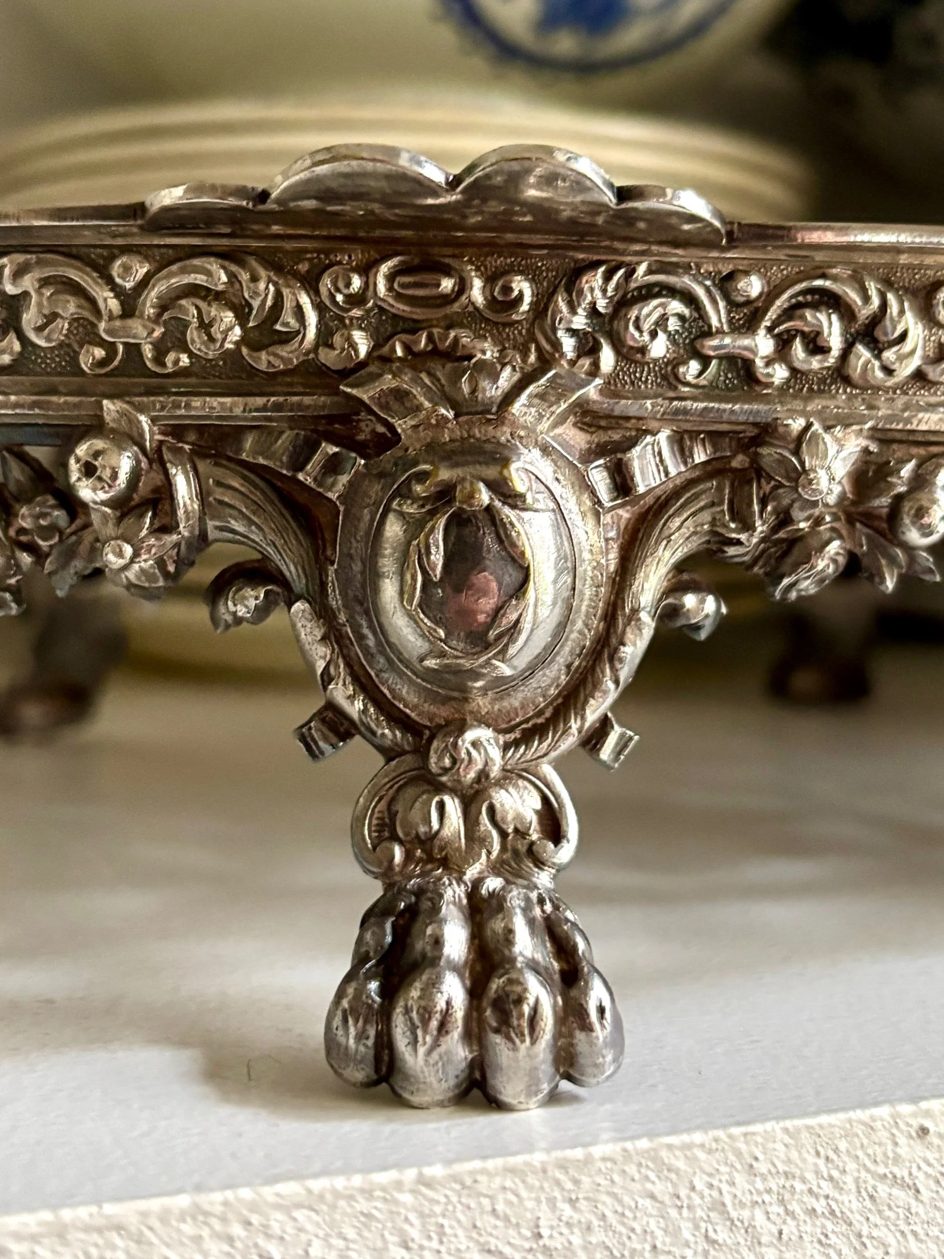 Plateau en métal argenté de forme rectangulaire décoré d’une couronne perlée courant sur tout le pourtour et muni de deux poignées décorées de la même façon.