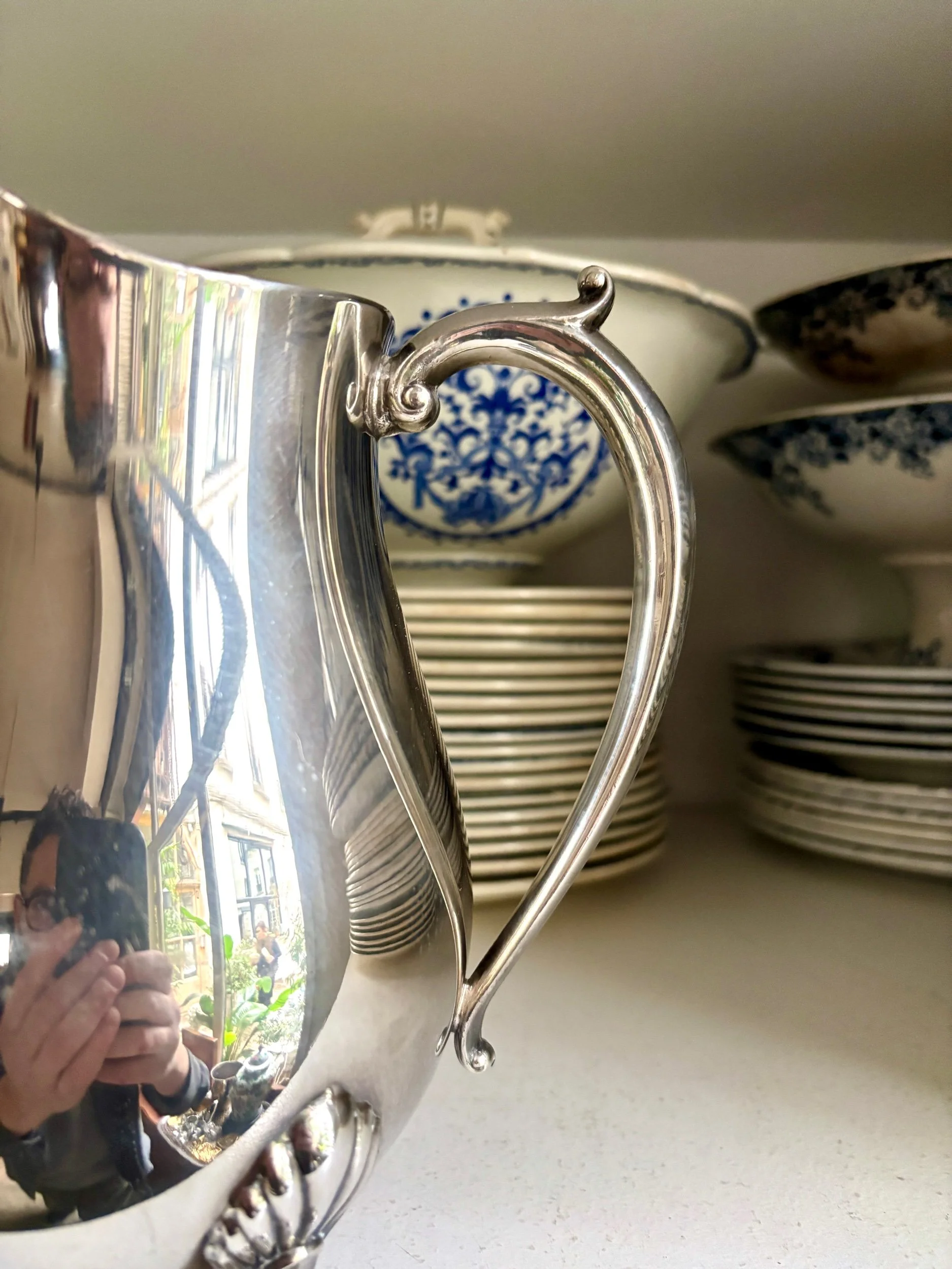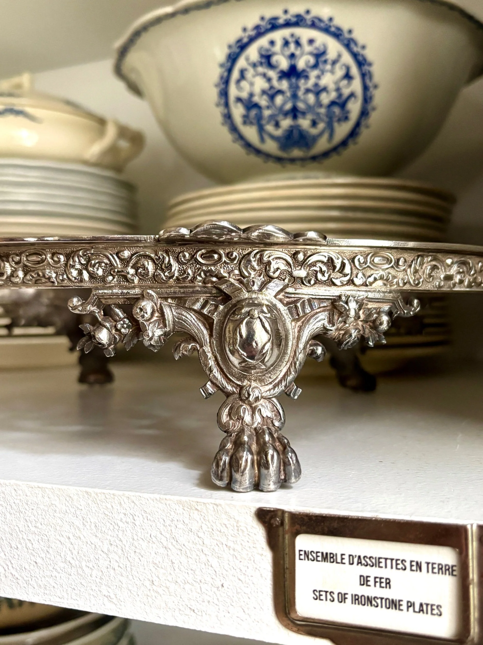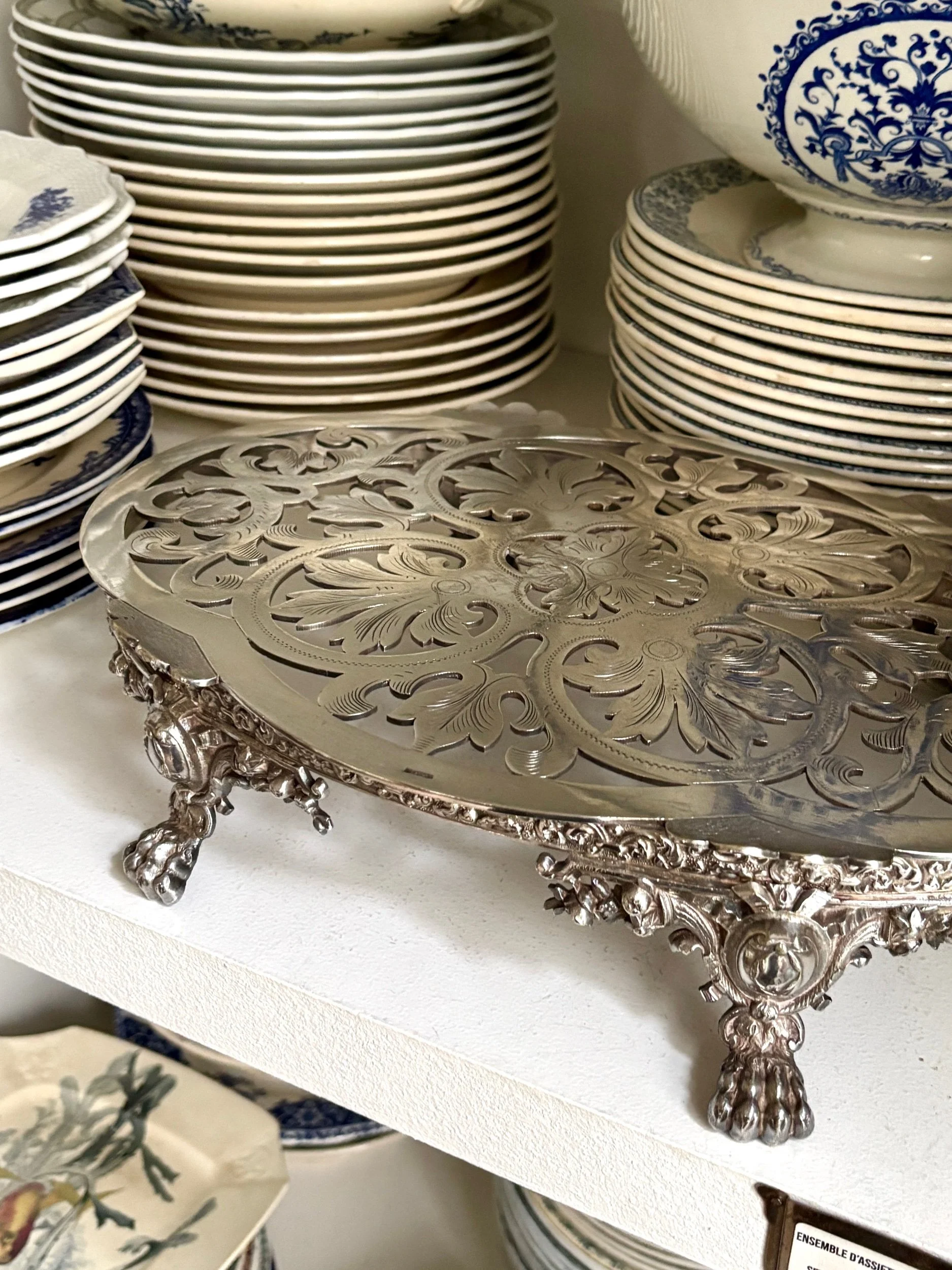 Plateau en métal argenté de forme rectangulaire décoré d’une couronne perlée courant sur tout le pourtour et muni de deux poignées décorées de la même façon.